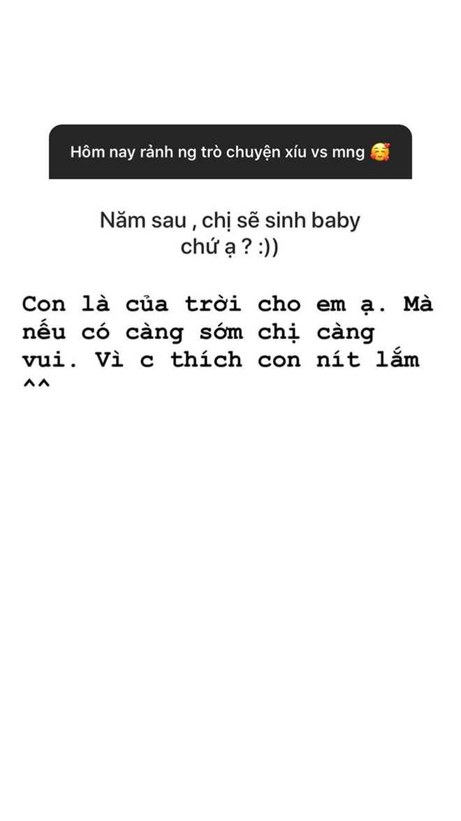 Rất nhiều người cùng tò mò việc đôi vợ chồng son có kế hoạch gì cho việc sinh con. Chia sẻ về vấn đề này, Minh Anh cho biết rằng mình quan niệm con là lộc trời cho nên nếu có sớm thì càng vui, càng nhiều con lại càng thích.