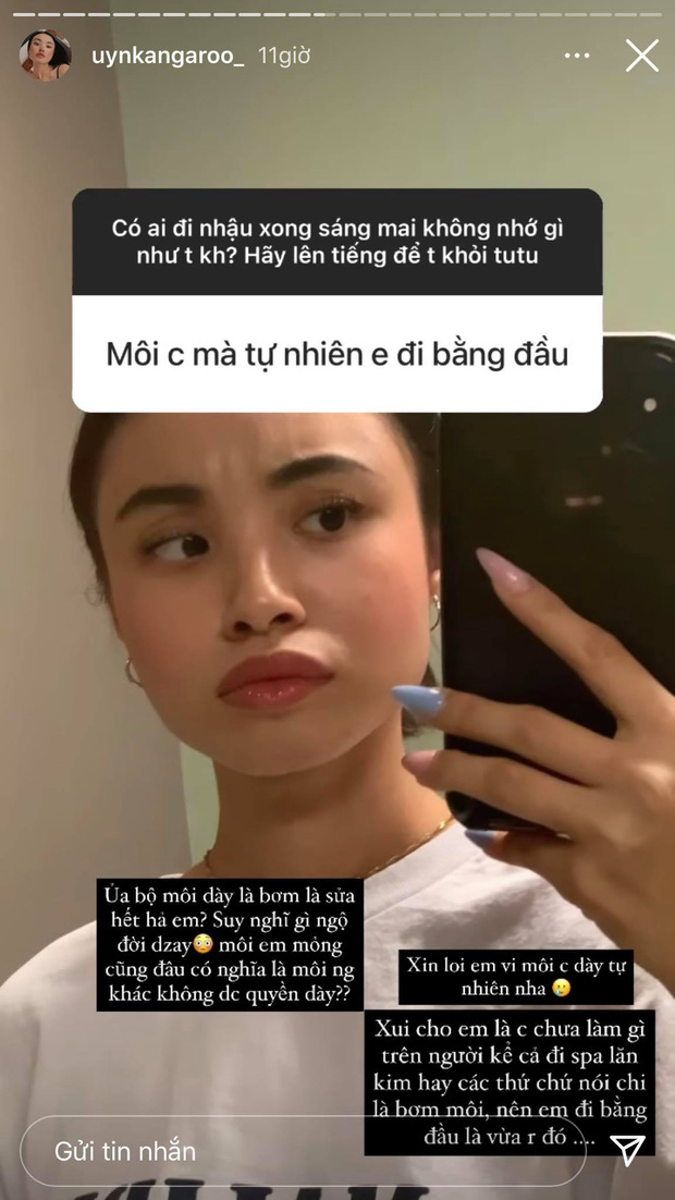 Được biết, cách đây ít ngày, Phương Uyên cũng vừa vướng vào một tình huống "dở khóc, dở cười". Chuyện là cô nàng mở Q&A trả lời fan hâm mộ của mình. Ngay sau đó có một người đã vào và nói vu vơ rằng môi của Phương Uyên đã qua "dao kéo". Trước nghi vấn trên, Phương Uyên cũng đã có màn "phản dame" cực gắt.