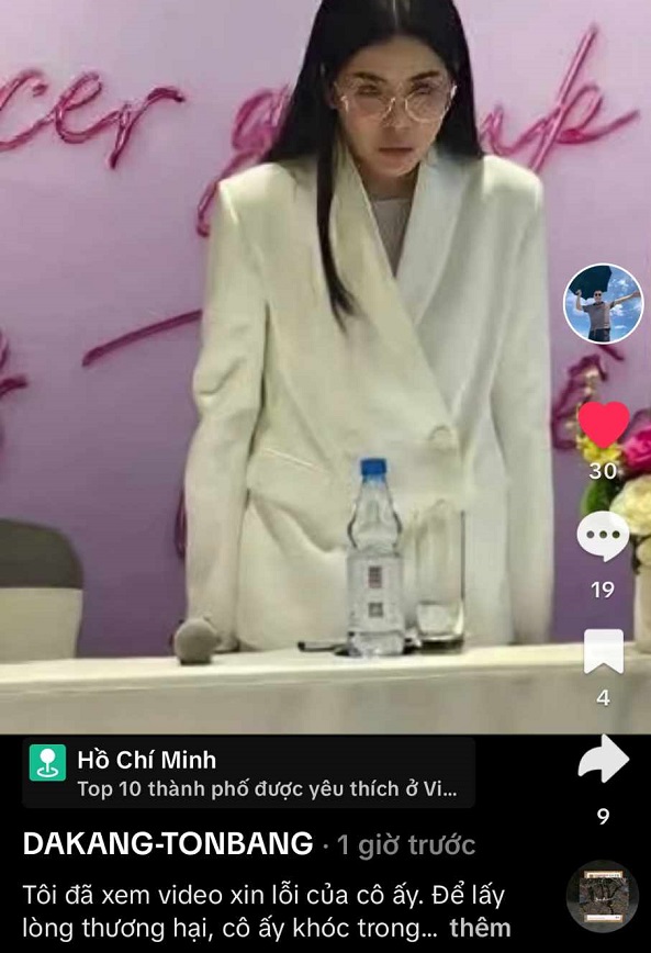 Anh chia sẻ: "Tôi đã xem video xin lỗi của cô ấy. Để lấy lòng thương hại, cô ấy khóc trong buổi gặp mặt. Là 1 hình mẫu, một người có nhiều người hâm mộ ủng hộ nhưng khi xảy ra vấn đề, những gì tôi thấy chỉ là những giọt nước mắt giả tạo.
