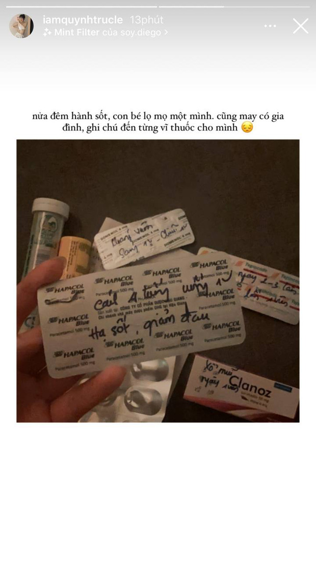 Cụ thể, cô nàng đăng tải story là 1 tấm ảnh chụp lại vài vỉ thuốc với lời dặn dò uống thuốc giờ nào kèm dòng: "Nửa đêm hành sốt, con bé lọ mọ 1 mình. Cũng may có gia đình, ghi chú đến từng vỉ thuốc cho mình".