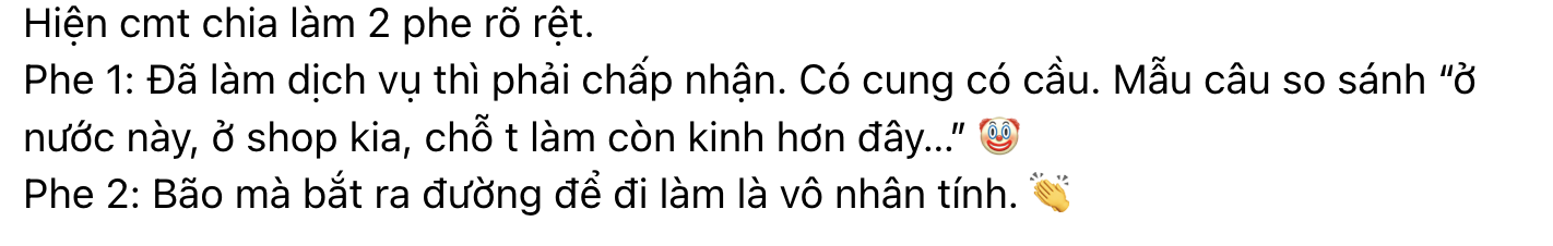 Tuy nhiên dù có phản bác lại thì dân tình vẫn cho rằng, hoạt động khi doanh làm cả năm cả tháng, vào những ngày bão gió thế này ai cũng vẫn có nhà để về phòng chống bão cũng như đảm bảo an toàn của mỗi cá nhân. Đóng cửa 1 - 2 ngày bão không ảnh hưởng nghiêm trọng đến chất lượng hay quá trình kinh doanh của các cửa hàng hay công ty mà nhất định phải yêu cầu nhân viên làm xuyên bão như vậy.