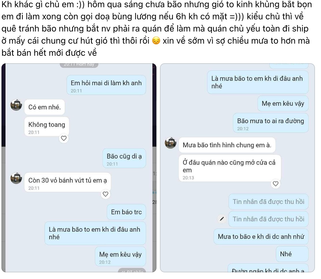 Nghe thì có vẻ vô lý nhưng thực tế không ít trường hợp mọi người vẫn chịu cảnh bị sếp nhắn đi làm đúng ngày mưa bão. Một tài khoản A cũng phản ánh lại sự việc của mình. Cụ thể A kể lại, sếp vẫn yêu cầu nhân viên đi làm, nếu không có mặt thì bùng lương. Sếp thì về quê để tránh bão nhưng bắt nhân viên đi làm, mà phải bán hết hàng mới được về.
