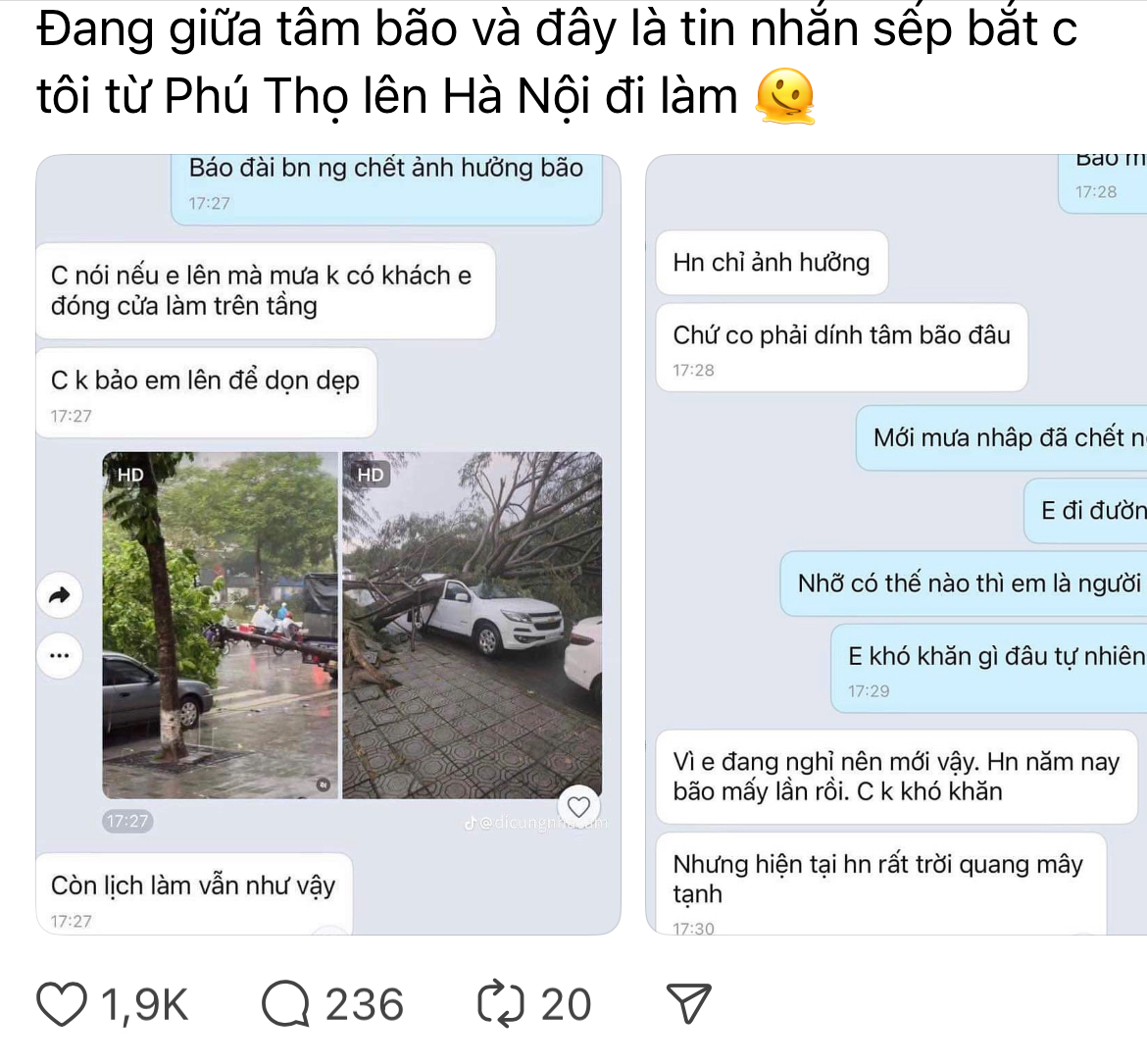 Một tài khoản tên L đã chia sẻ câu chuyện của chị cô khi bị sếp yêu cầu đi từ Phú Thọ lên Hà Nội để đi làm ngày gió bão. Câu chuyện nhận về hơn 1,9 nghìn lượt quan tâm trên Thread.