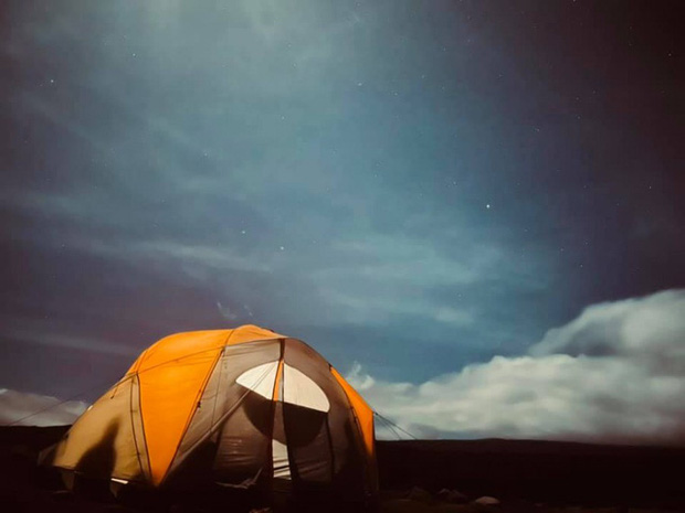 Một trong những điều mình nhớ nhất là bầu trời sao đẹp không tưởng và sâu thăm thẳm, dưới ánh trăng sát rằm chiếu vằng vặc trong cả hành trình. Quả thực, mình không biết dùng từ nào để tả về độ dày đặc của những vì sao, và camera máy ảnh của mình cũng không thể ghi lại trọn vẹn được vẻ đẹp của bầu trời ấy. Hãy tưởng tượng: khi bạn nắm những nắm cát vàng trên tay và ném lên bầu trời đêm, số hạt cát đó sẽ được đính lên bầu trời, lấp lánh và không thể đếm được. Bầu trời sao trên núi mà mình đã may mắn được chiêm ngưỡng là như vậy đấy!