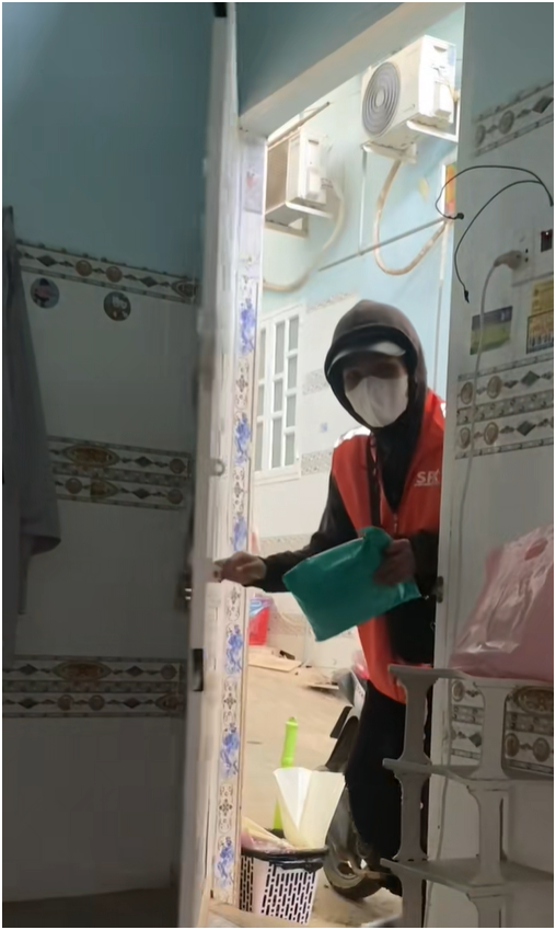 Theo nội dung clip được đăng tải trên TikTok, nữ khách hàng đang ngủ trong phòng trọ thì bất ngờ nghe tiếng shipper gọi lớn bên ngoài yêu cầu nhận hàng. Cánh cửa mở hé, sau đó được đẩy rộng hơn khi nam shipper đứng ngoài thông báo đơn hàng trị giá 118 nghìn đồng. Từ bên trong, cô gái chỉ kịp đưa tay ra nhận.
