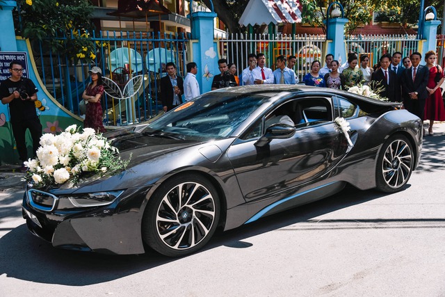Xemesis cũng dùng xe sang BMW i8 có giá 7,5 tỷ để rước nàng về dinh. Không những thế dàn xe rước dâu trong đám cưới cũng rất đắt đỏ như McLaren 650S Spider, Lexus, Audi, Ranger Rover,...