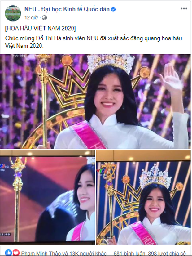 Rõ ràng, chiến thắng của tân Hoa hậu Việt Nam 2020 đã đem đến niềm tự hào lớn cho trường ĐH Kinh tế Quốc dân. Nhiều sinh viên hi vọng Đỗ Hà sẽ làm thật tốt vai trò trong suốt 2 năm đương nhiệm, đồng thời chăm đi học để được gặp Hoa hậu nhiều hơn.
