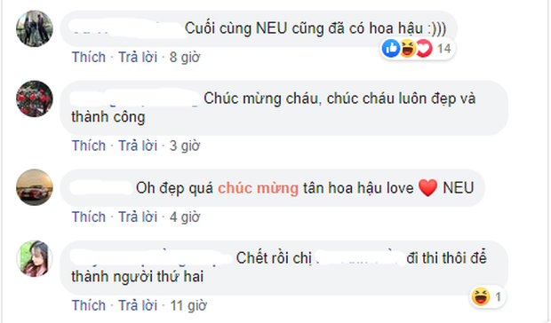 Nhiều sinh viên cũng không quên "hưởng ké" may mắn khi nhanh chóng tag tên bạn thân cùng lời nhắn: "Nhanh đi thi để trở thành Hoa hậu thứ 2 của trường", "Hà nhà người ta năm 19 tuổi đã trở thành Hoa hậu, Hà nhà mình thế nào?"...