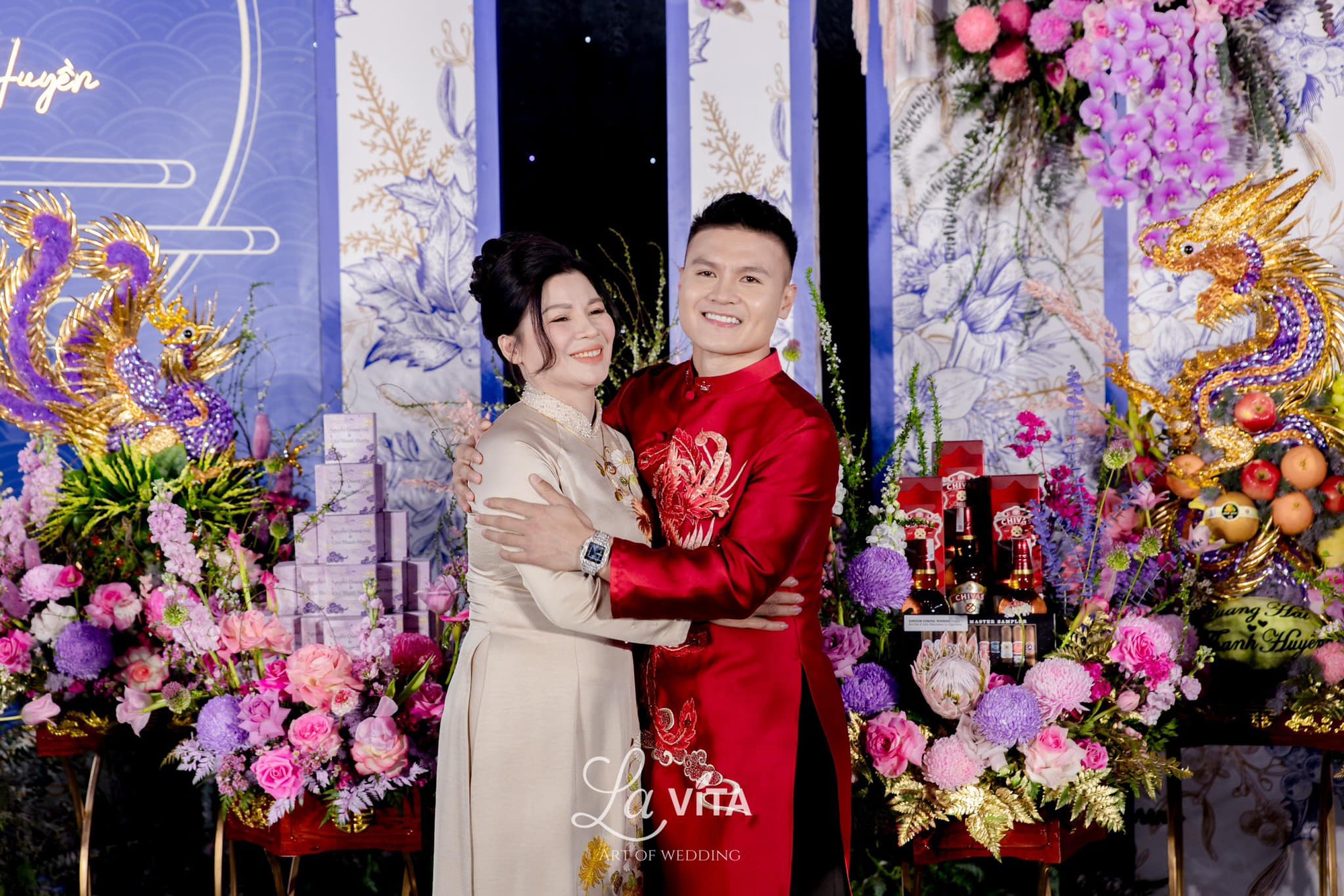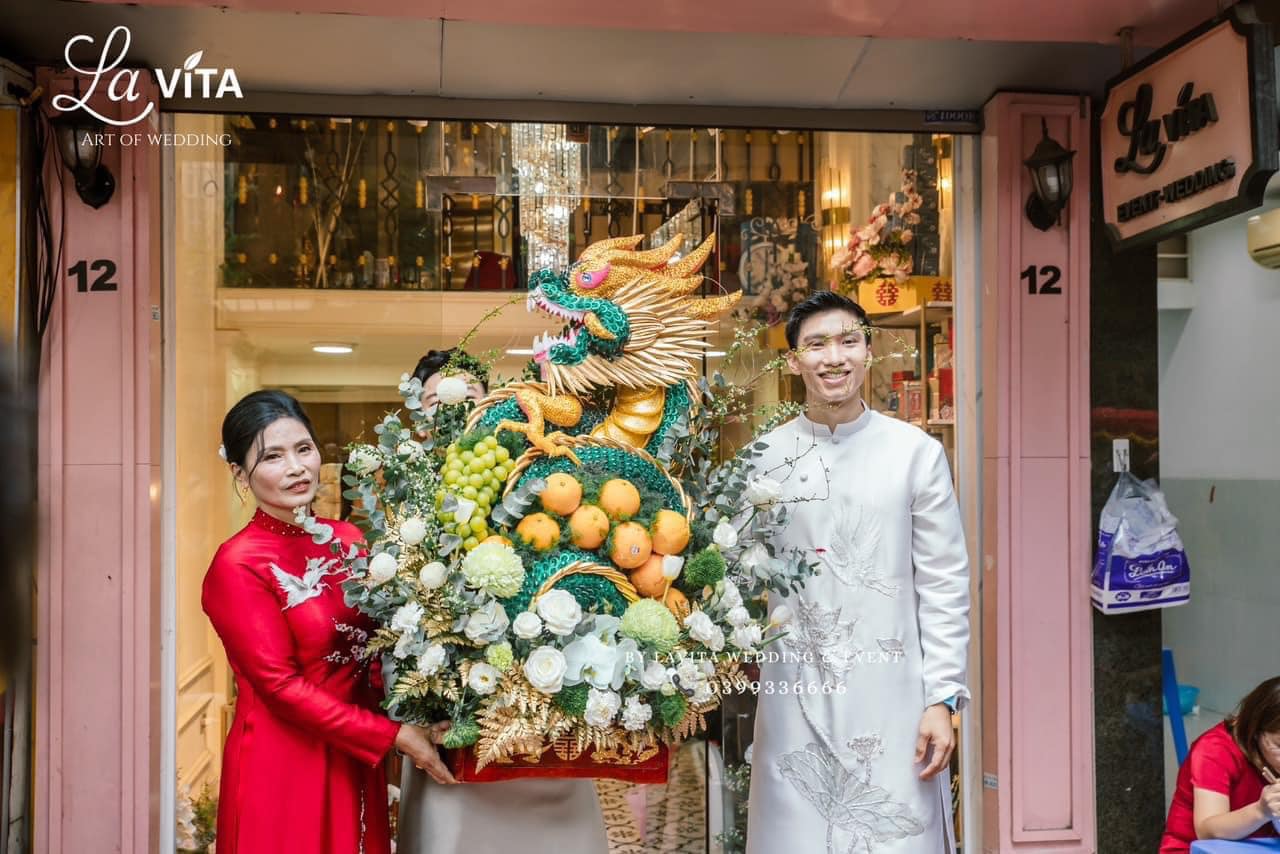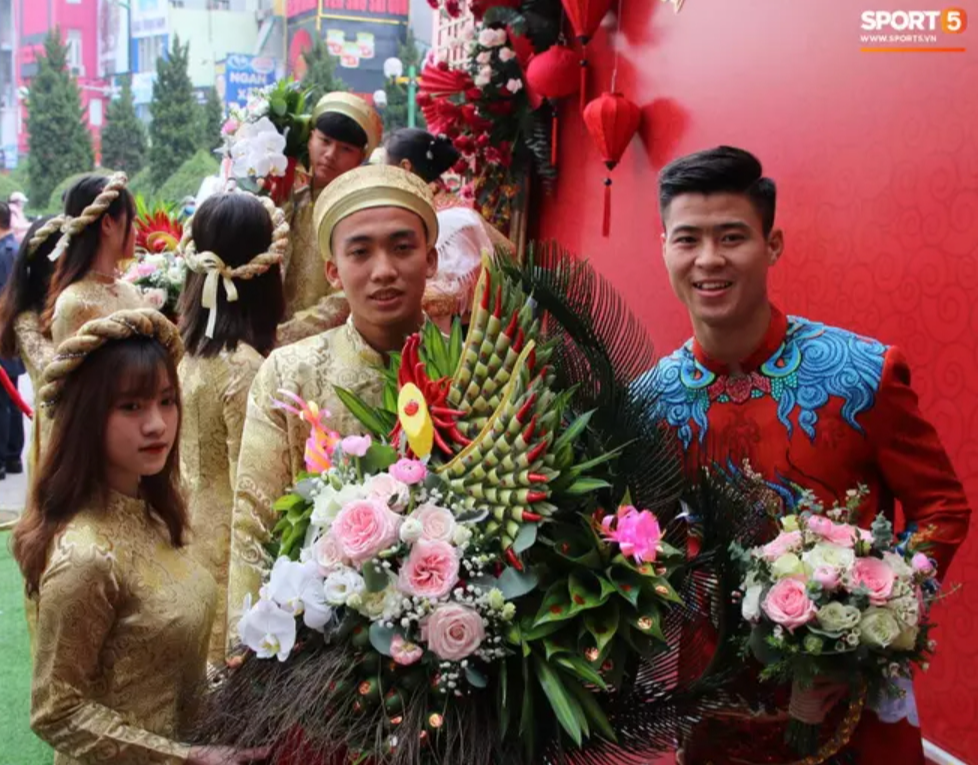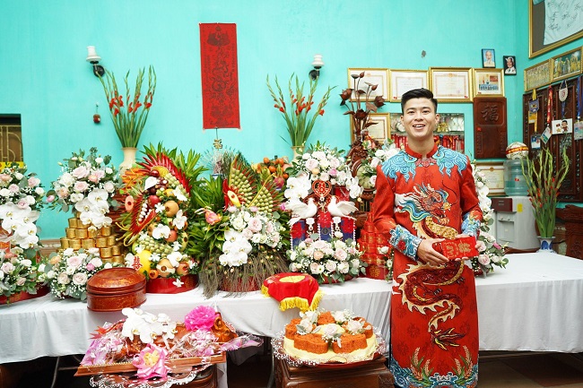 Ngày trọng đại của mình, cầu thủ xuất thân từ lò đào tạo Hoàng Anh Gia Lai chọn dàn tráp 7 sính lễ với trầu cau, hoa quả tông màu trắng thanh thoát. Ngoài ra, trong một hình ảnh khi cặp đôi làm lễ gia tiên, còn có sự xuất hiện của bánh cốm và bánh phu thê.