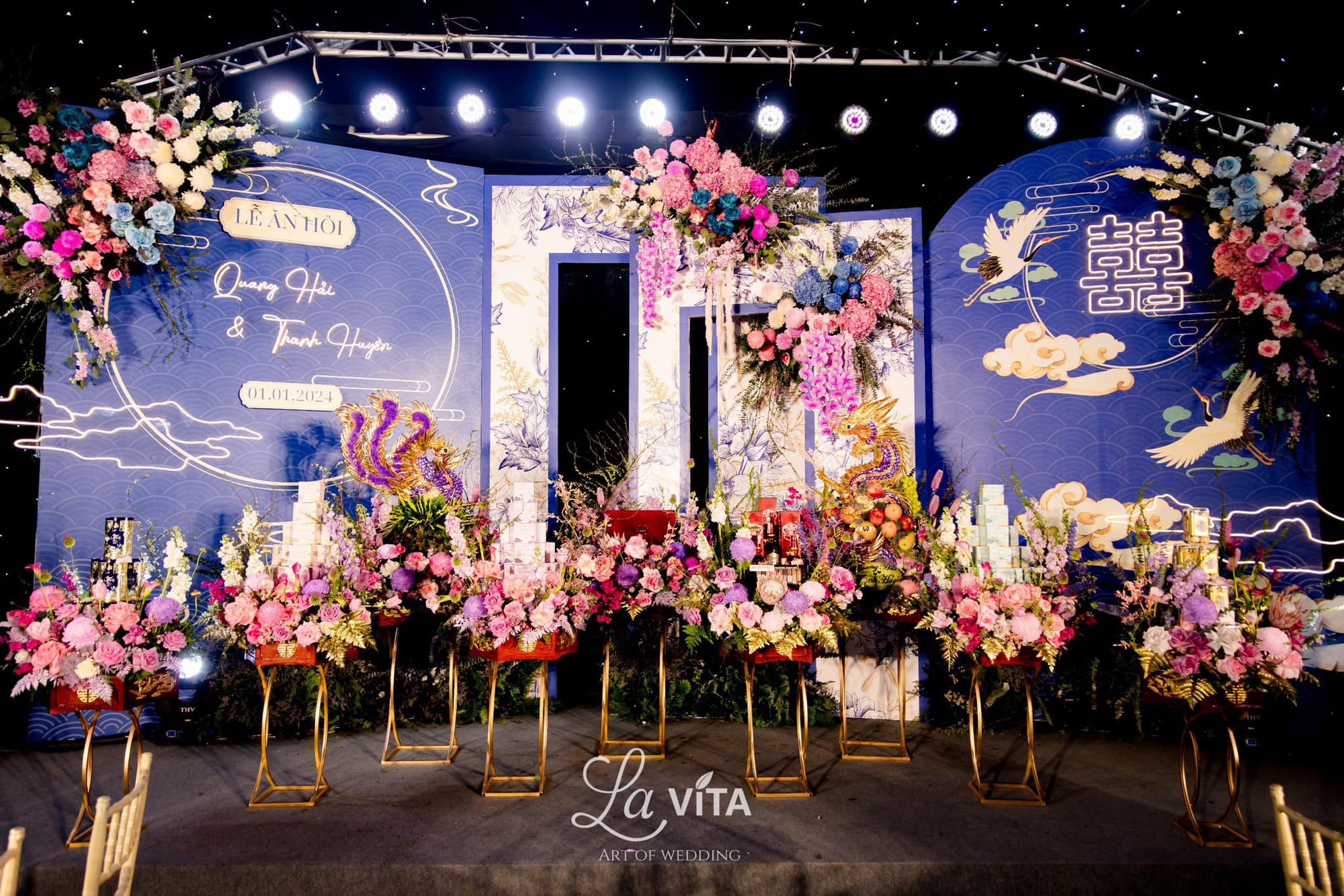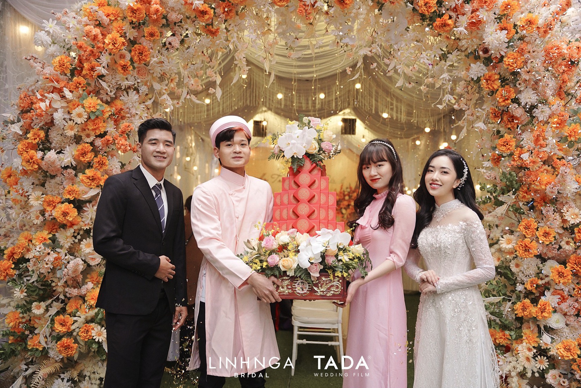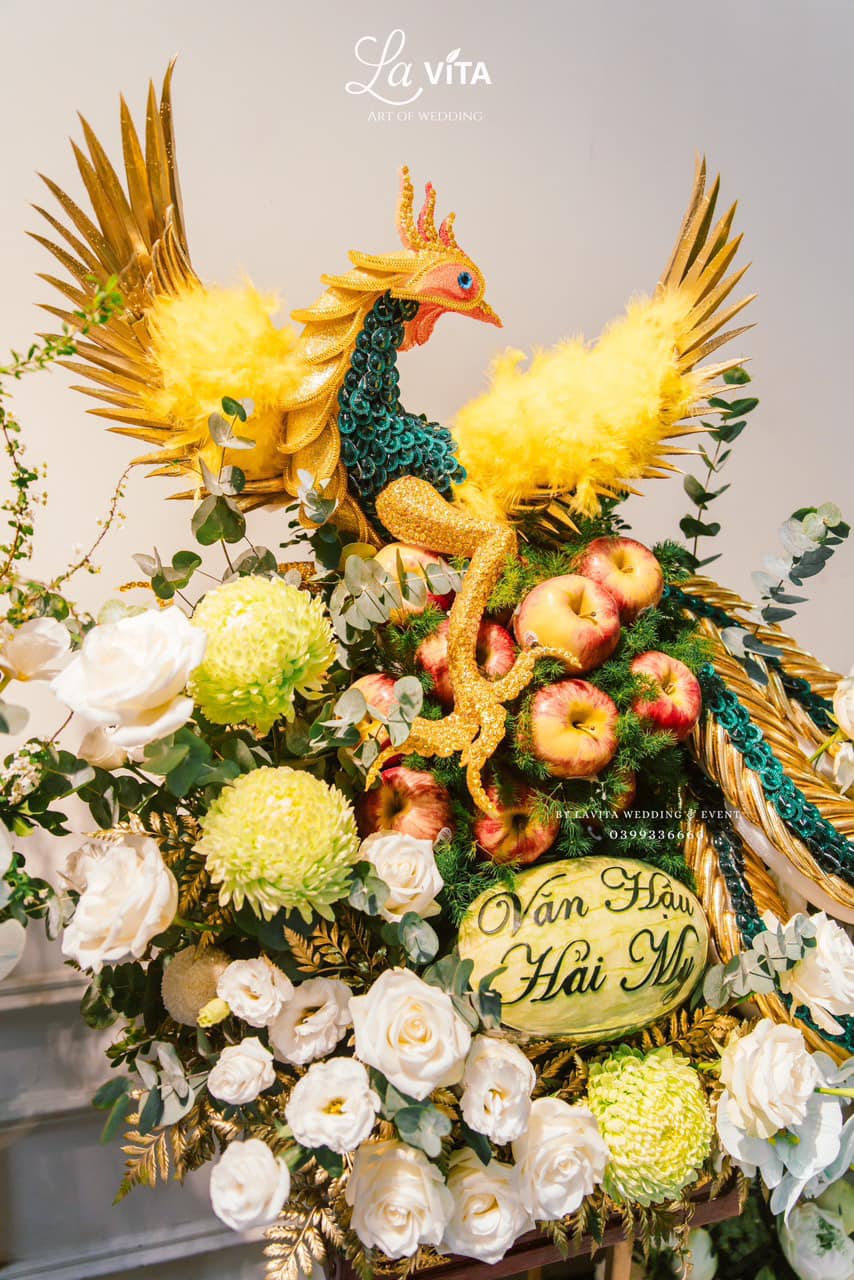 Ngày trọng đại của mình, cầu thủ xuất thân từ lò đào tạo Hoàng Anh Gia Lai chọn dàn tráp 7 sính lễ với trầu cau, hoa quả tông màu trắng thanh thoát. Ngoài ra, trong một hình ảnh khi cặp đôi làm lễ gia tiên, còn có sự xuất hiện của bánh cốm và bánh phu thê.