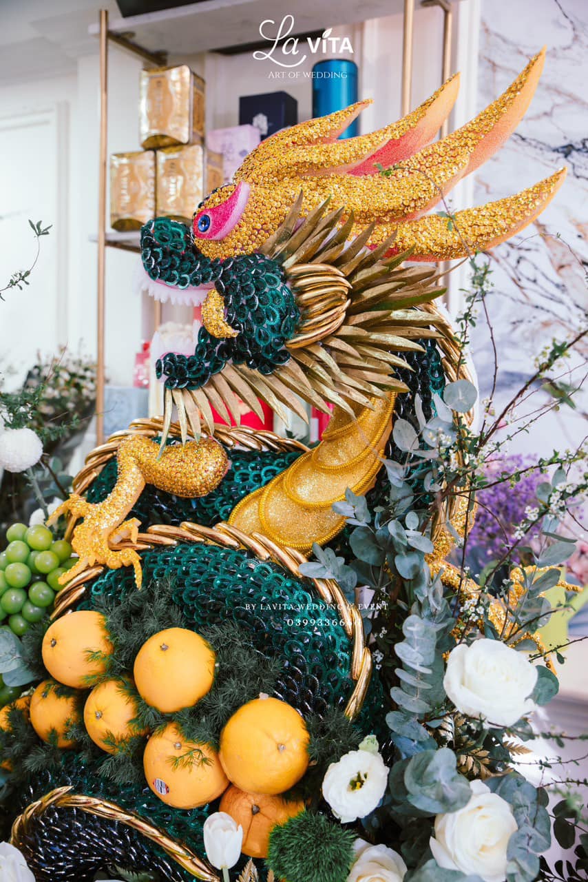 Trước Quang Hải, Đoàn Văn Hậu cũng chọn bộ 9 tráp ăn hỏi với điểm nhấn là cặp rồng phượng. Tuy nhiên, khác với người anh thân thiết, của cầu thủ quê Thái Bình là cặp rồng phượng màu xanh ngọc dát vàng. Những chi tiết như đầu, vảy, móng của rồng và phượng đều dát vàng thật 100%.
