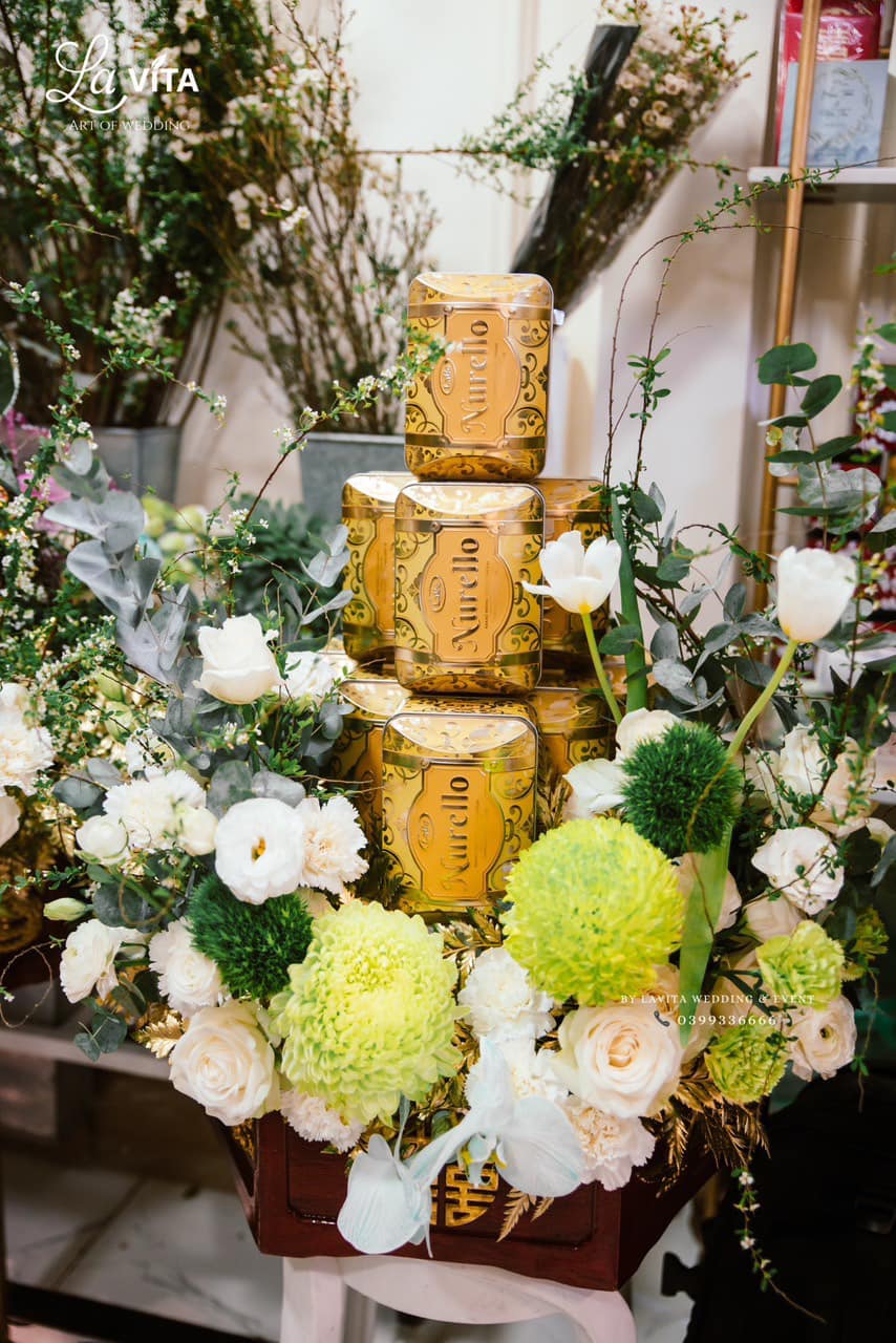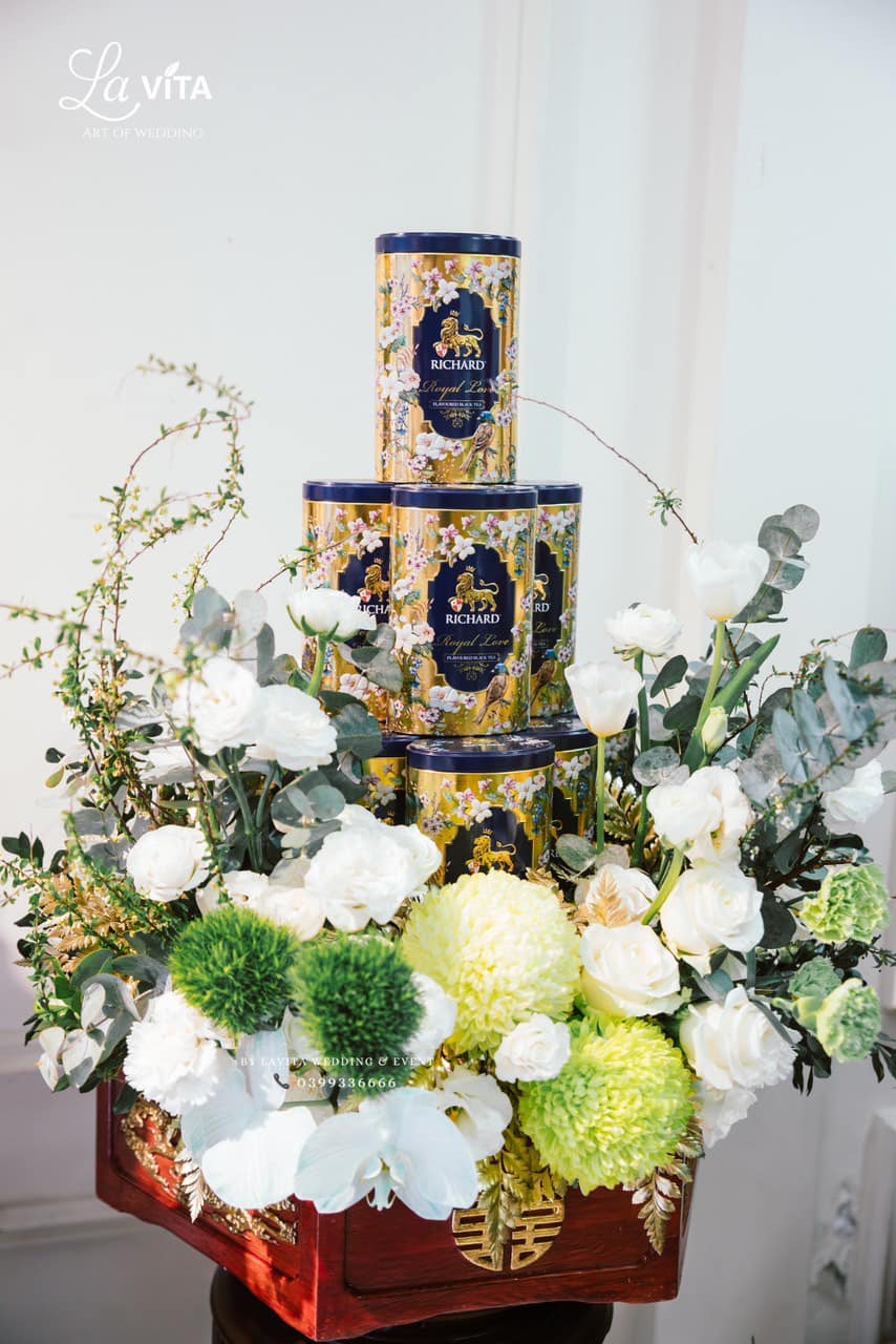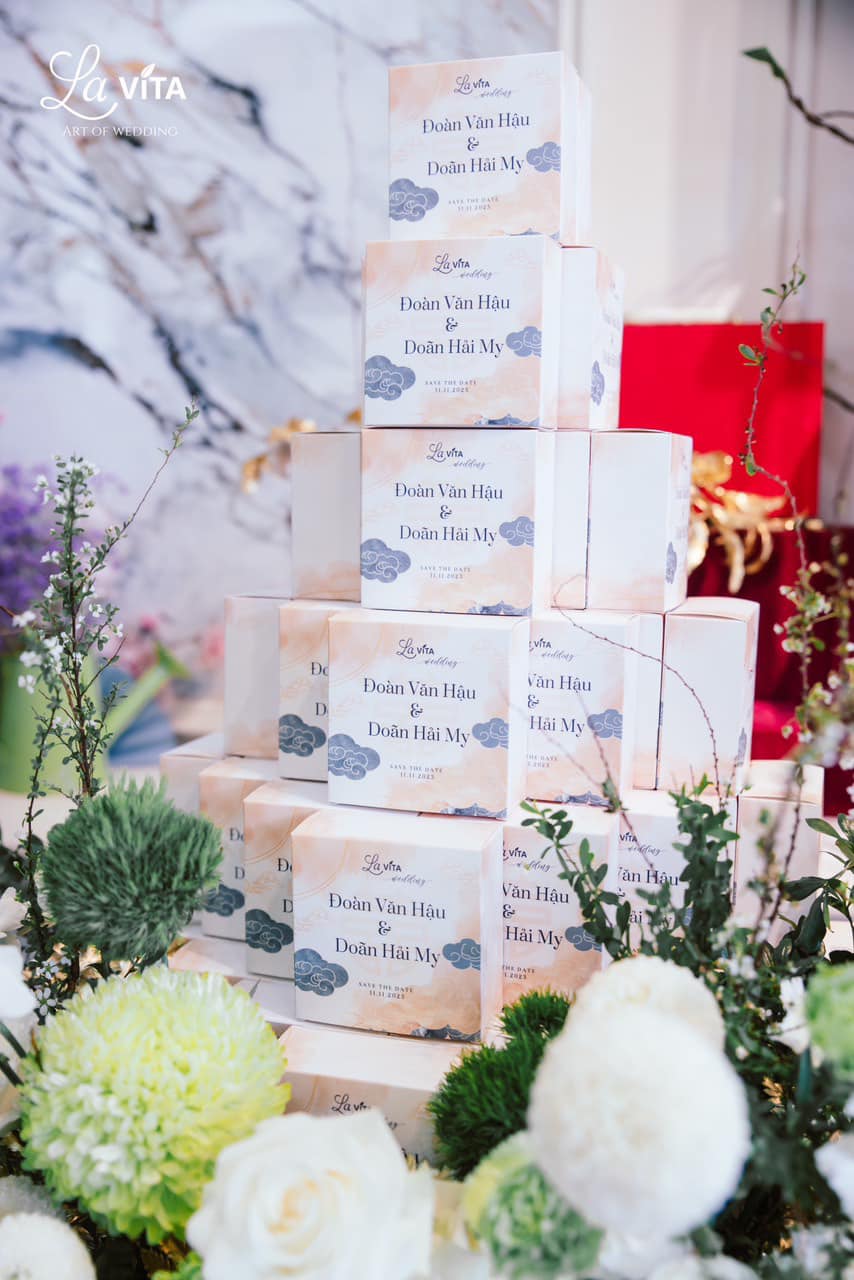 Ngoài ra, các mâm lễ khác cũng là tháp bánh in tên cô dâu chú rể, kẹo, rượu nhập ngoại, được chọn theo tông màu chủ đạo trắng, xanh.