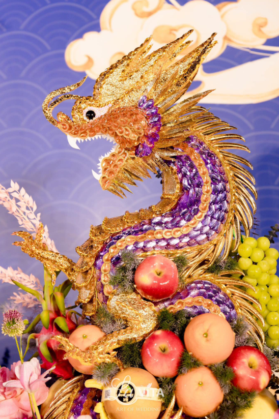 Mâm lễ quả và trầu cau được kết rồng phượng cầu kỳ. Bánh ăn hỏi, chè, mứt... được xếp tháp. Không những thế, còn có 2 mâm lễ đặc biệt là lợn quay và xôi gấc. Ngoài ra, áo dài ăn hỏi và làm lễ của Quỳnh Anh và Duy Mạnh cũng được thiết kế riêng, lấy hình ảnh rồng phượng làm chủ đạo.