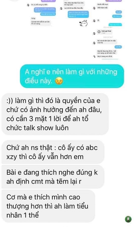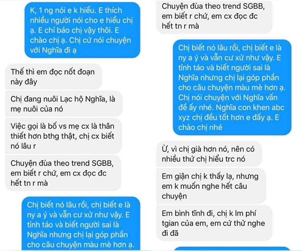 "Người thứ ba" cũng nhắn tin qua và khẳng định mình với bạn trai của cô gái là trong sáng. "Chị đang nuôi Lạc hộ N. là mẹ nuôi của nó. Việc gọi là bố và mẹ cũng là thân thiết hơn, chị biết nó lâu rồi. Chuyện này là đùa thôi, em cũng đọc được hết tin nhắn rồi mà". Cô gái này khẳng định mình không sai và không tác động vào chuyện của hai người.