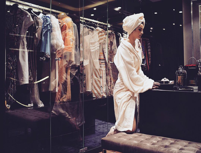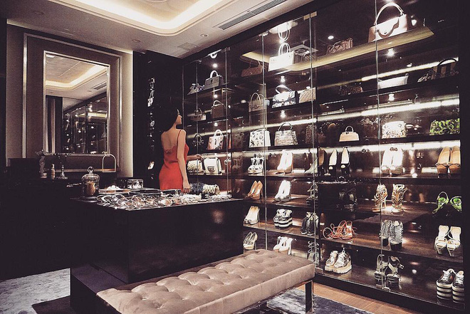 Thế nhưng có lẽ góc yêu thích nhất và cũng được Huyền Baby chăm chút nhất phải là phòng thay đồ. Với những tủ hàng hiệu cùng đèn pha lê lấp lánh, nhiều người nhận xét, đây là phòng của "nữ hoàng" chứ không còn là của người thường.