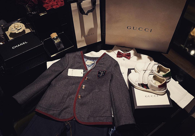 Đương nhiên Củ Cải và Sữa - tiểu thư và thiếu gia nhà Huyền Baby cũng được đắp toàn hàng hiệu từ khi nhỏ xíu, không hề thua kém mẹ.