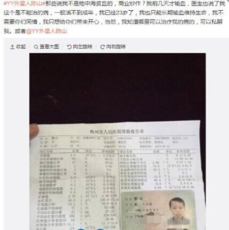 Sau khi xuất hiện những tin đồn về sự thật thân thế của anh, Trần Sơn đã đăng tải một hình ảnh khám bệnh kèm với nội dung như sau: "Có những người nói tôi không phải mắc hội chứng Thalassemia, chỉ là giả tạo. Mấy hôm trước tôi phải đi truyền máu đây này, bác sĩ nói căn bệnh này không thể chữa được, cùng lắm chỉ sống tới khi trưởng thành mà thôi. Năm nay tôi đã 23 tuổi rồi, tôi chỉ còn cách truyền máu để duy trì mạng sống của mình. Tôi không cần sự đồng cảm, sự đồng tình của các bạn. Tôi chỉ muốn đem lại sự vui vẻ cho mọi người mà thôi".