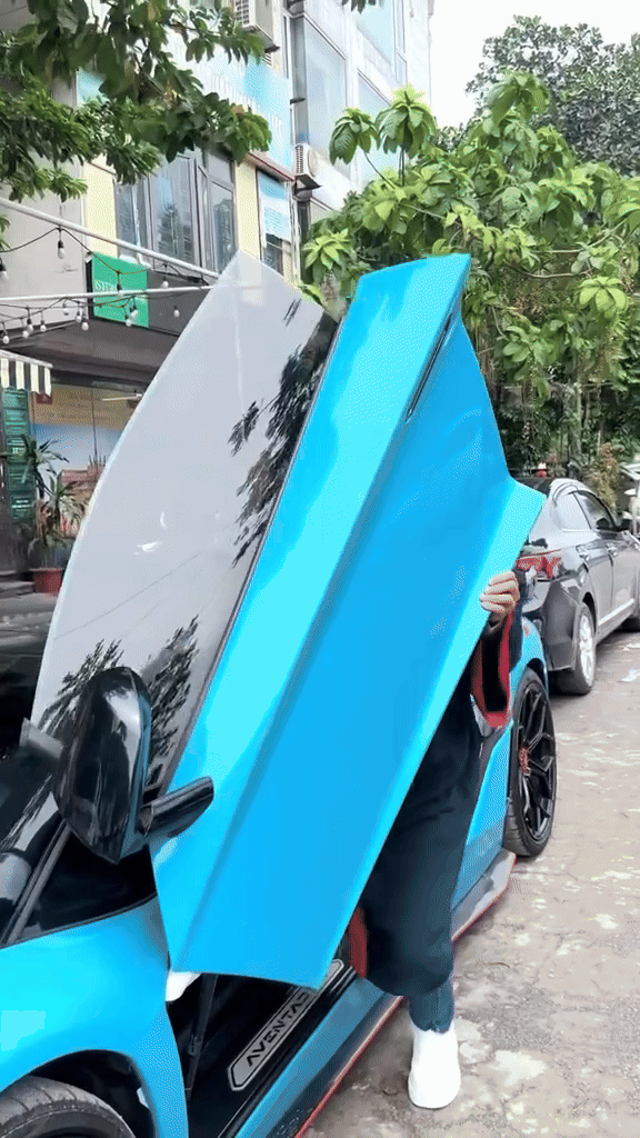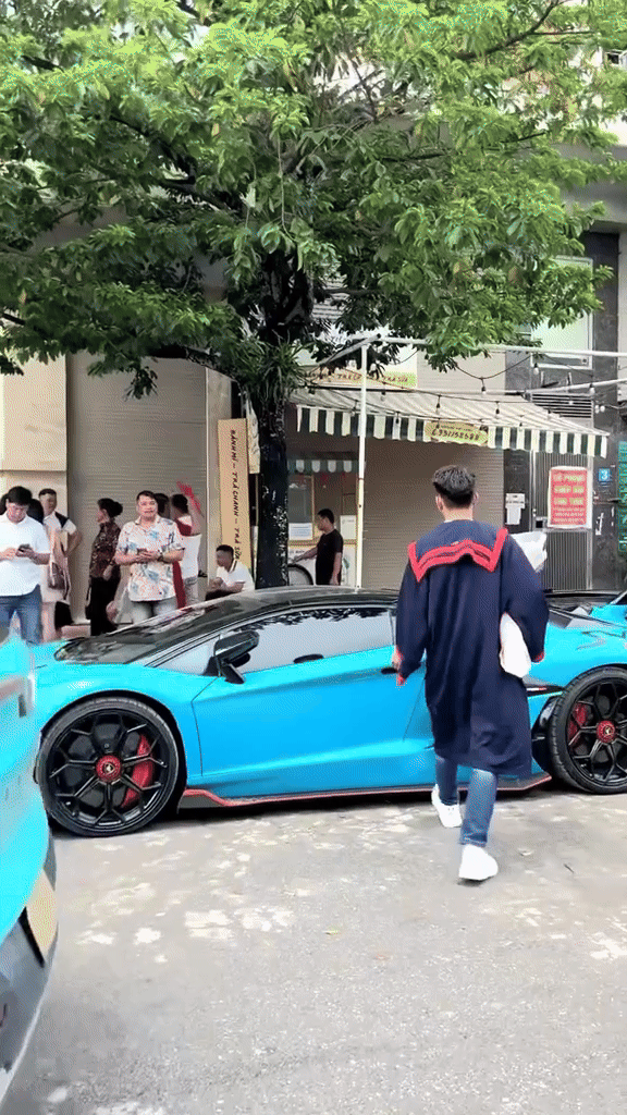 Mới đây trên mạng xã hội xôn xao clip ghi lại cảnh một nam thanh niên mặc áo cử nhân, bước lên chiếc Lamborghini Aventador SVJ màu xanh dương nhạt.