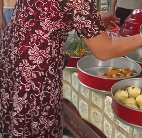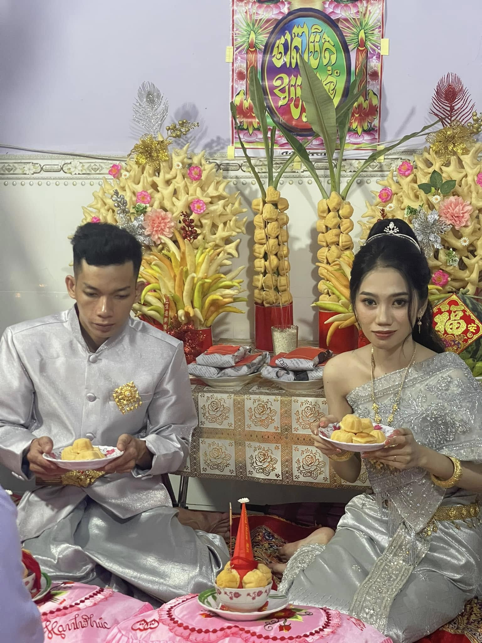 Đầu tháng 12 vừa rồi, nhà gái làm lễ nhóm họ theo phong tục người Khmer, có mời gia đình chú rể tham dự. Lần này, nhà trai đưa thêm 6 mâm quả sang làm lễ. Số mâm quả được chuẩn bị chu đáo.