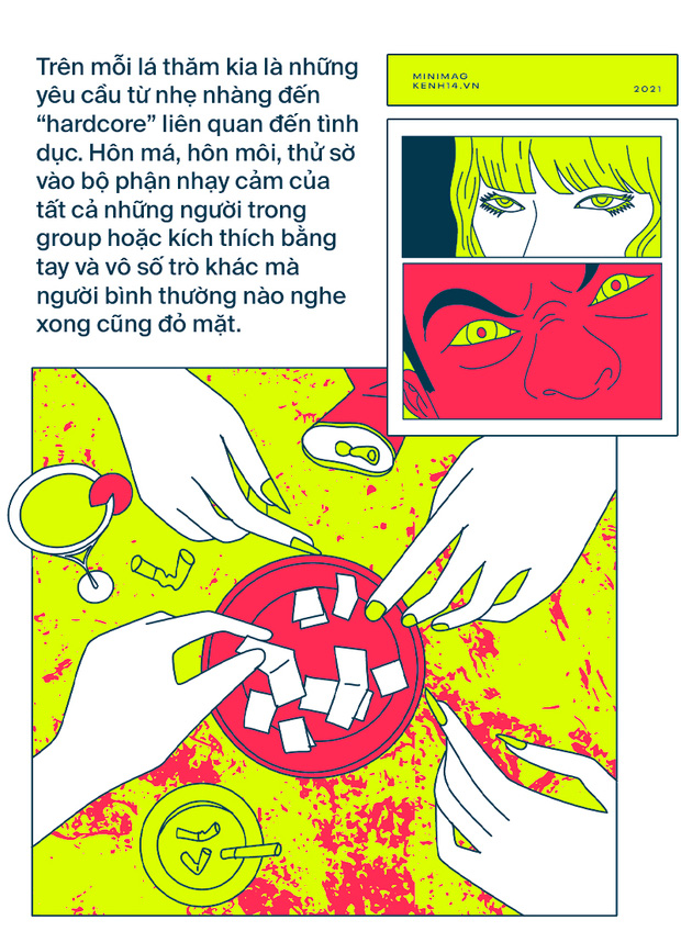Gần 20 người quây thành một vòng tròn trong phòng khách chưa đến 30m2, dù cố ý hay vô tình thì da thịt vẫn chạm vào nhau nóng hổi. Host mang ra một chiếc hộp chứa khoảng 15 lá thăm được ghi sẵn, gấp kĩ. Trên mỗi lá thăm kia là những yêu cầu từ nhẹ nhàng đến "hardcore": hôn má, hôn môi, thử sờ vào bộ phận nhạy cảm của những người trong group, kích thích bằng tay và vô số trò mà người bình thường nào nghe xong cũng đỏ mặt.