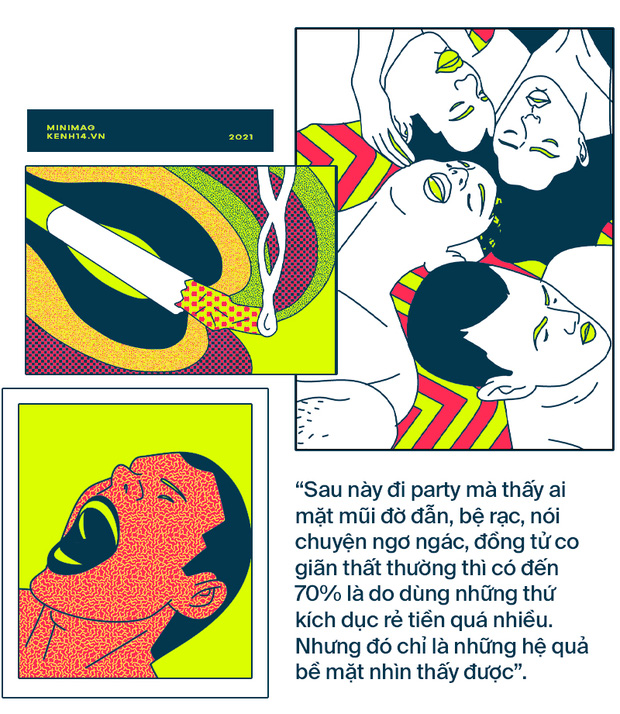"Sau này đi party mà thấy ai mặt mũi đờ đẫn, bệ rạc, nói chuyện ngơ ngác, đồng tử co giãn thất thường thì có đến 70% là do dùng những thứ kích dục rẻ tiền quá nhiều. Nhưng đó chỉ là những hệ quả bề mặt nhìn thấy được, chứ bên trong có khi còn bị nhiễm độc, suy tim mạch, gan thận nát bét, huyết áp ở mức báo động và chỉ cần một cú sốc gì đó là ‘xin vĩnh biệt’ ngay. Cuối năm ngoái trong giới truyền tai nhau thông tin có những người đi sex party và ‘hít’ quá nên tổn thương võng mạc, mất thị lực vĩnh viễn. Nhưng nhiều người vẫn chưa sợ, hoặc cũng sợ nhưng lỡ phụ thuộc, lỡ nghiện cái cảm giác lâng lâng đó rồi nên vẫn miệt mài dùng." - một dân chơi cho hay.