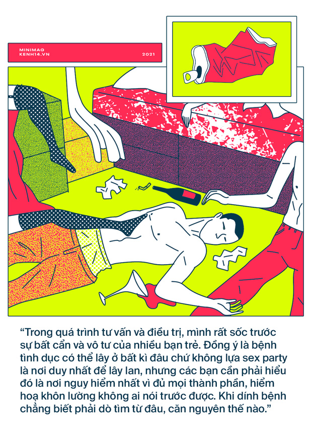 Khi nhắc đến những bữa tiệc tình dục, Hưng không giấu được sự bức xúc: "Có những bạn sinh năm 2K1, 2K2 nhưng đến đây xét nghiệm nhanh thì đã dương tính với HIV hoặc nhiễm STDs (thuật ngữ chỉ những bệnh lây qua đường tình dục - PV). Trong quá trình tư vấn và điều trị, mình rất sốc trước sự bất cẩn và vô tư của nhiều bạn trẻ. Một số bạn không biết mình từng quan hệ với ai, thậm chí không nhớ rõ số người mà mình đã quan hệ. Hỏi đến việc sử dụng biện pháp an toàn hay không thì ú ớ ‘em không rõ’, ‘lúc đầu có nhưng sau đó thì không’...
