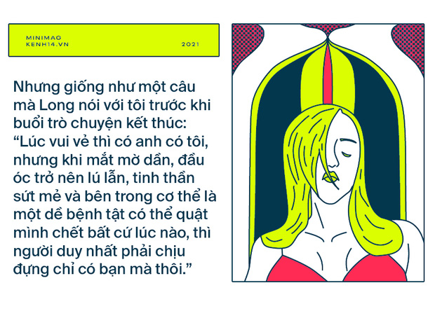 Nhưng giống như một câu mà Long nói với tôi trước khi buổi trò chuyện kết thúc: "Lúc vui vẻ thì có anh có tôi, nhưng khi mắt mờ dần, đầu óc trở nên lú lẫn, tinh thần sứt mẻ, tâm hồn kiệt quệ và bên trong cơ thể là một dề bệnh tật có thể quật mình chết bất cứ lúc nào, thì người duy nhất phải chịu đựng chỉ có mình mà thôi."