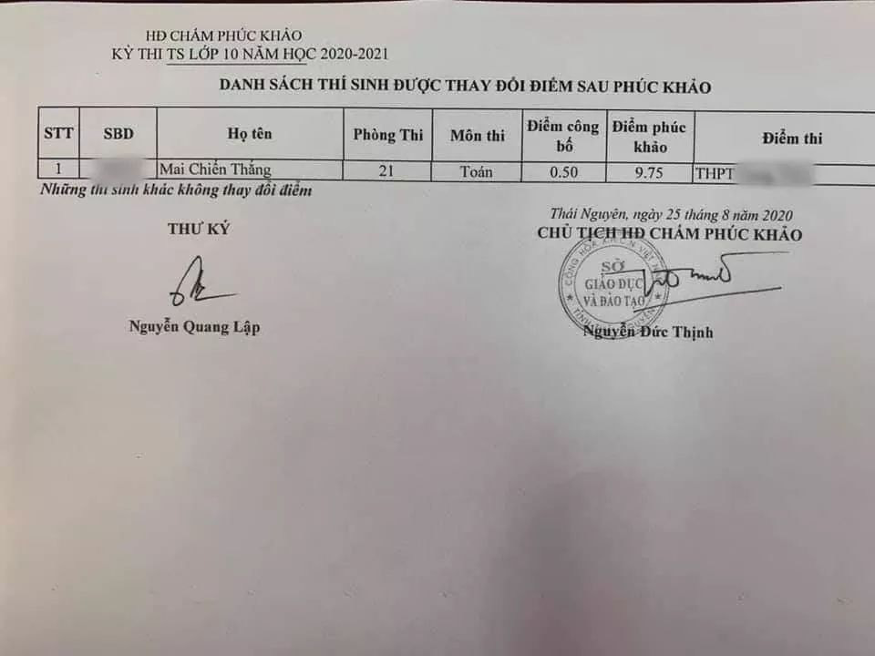 Tuy nhiên, khi chúng tôi liên lạc với thầy giáo của Thắng, được biết nam sinh này học rất tốt môn Toán, kết quả luôn nằm trong top đầu của lớp trước đó. Do đó, số điểm chỉ 0,5 khiến tất cả mọi người đều bất ngờ. Cũng may là cậu đã nghe theo sự tư vấn của thầy để quyết định xin phúc khảo.