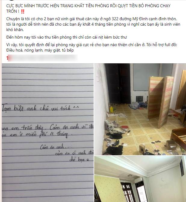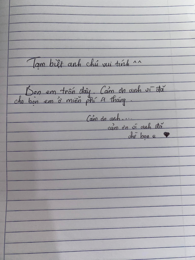 Càng đáng chú ý hơn khi người này quay lại thu tiền phòng thì thấy chỉ còn lại bức thư với dòng chữ: "Tạm biệt anh chủ vui tính. Bọn em trốn đây, cảm ơn anh vì đã cho bọn em ở miễn phí 4 tháng. Cảm ơn anh... Cảm ơn anh vì đã chờ bọn em". Cùng với đó, những bức hình phòng trọ bừa bộn đăng kèm càng khiến nhiều người thêm bức xúc.