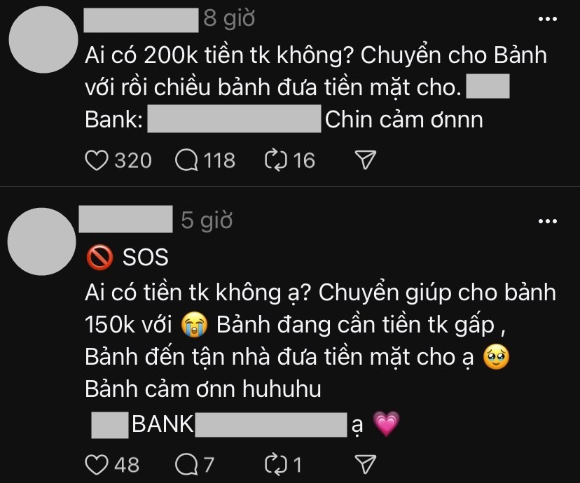 Chưa kể phần lớn bài đăng đều là đi copy với cùng nội dung kiểu: "Ai có tiền tài khoản không? Chuyển cho bảnh rồi chiều bảnh đưa tiền mặt cho" hoặc "Em vừa bị lừa, mọi người có thể giúp em 2-3k mua tạm gói mì, mua tạm suất cơm với ạ". Có khác chăng chỉ là số tài khoản cùng với ngân hàng mà thôi!