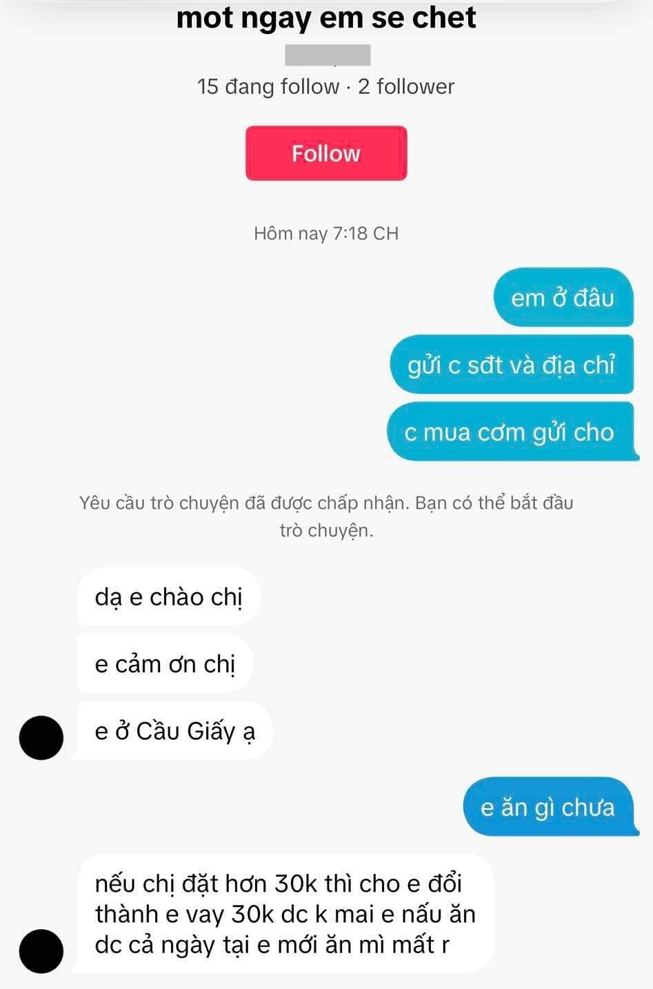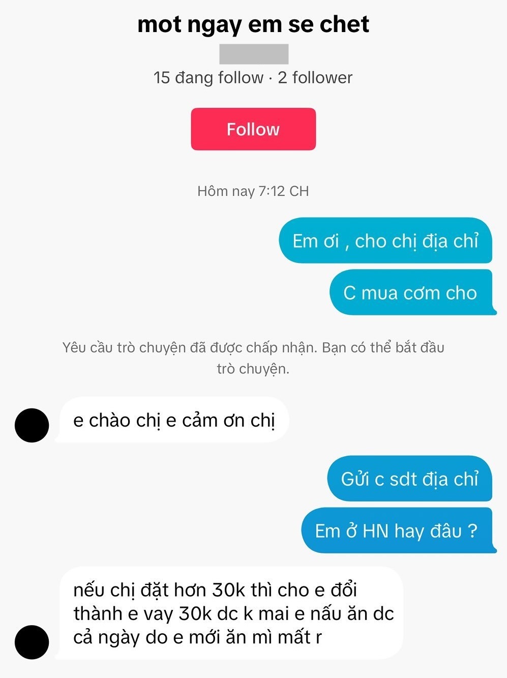 Thấy thương cảm cho bạn sinh viên kia, M.L liền nhắn tin hỏi địa chỉ để mua cơm cho thì người này không đồng ý, chỉ muốn "vay" 30k với lý do để mai nấu ăn vì hôm nay đã ăn mì rồi. Nghi ngờ câu trả lời này, M.L đã dùng một tài khoản khác để nhắn tin thì nhận được câu trả lời y hệt: không nhận cơm, chỉ nhận tiền.