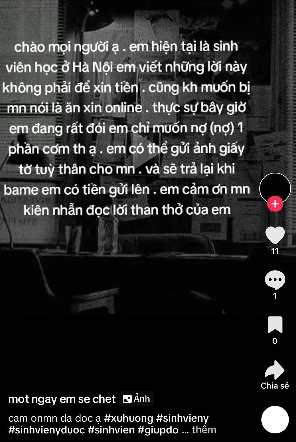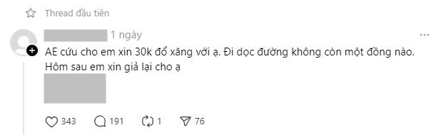 Một cư dân mạng khác có nickname M.L chia sẻ câu chuyện xin tiền online từng gặp trên TikTok sang Threads để thảo luận vì thấy cấn cấn. Theo đó M.L tình cờ gặp bài đăng với nội dung đầy mùi mẫn: "Chào mọi người ạ. Em hiện tại là sinh viên học ở Hà Nội. Em viết những lời này không phải để xin tiền, cũng không muốn bị mọi người nói là ăn xin online. Thực sự em đang rất đói, em chỉ muốn nợ 1 phần cơm thôi ạ. Em có thể gửi ảnh giấy tờ tuỳ thân cho mọi người và sẽ trả lại khi ba mẹ có tiền gửi em. Em cảm ơn mọi người kiên nhẫn đọc lời than thở của em".