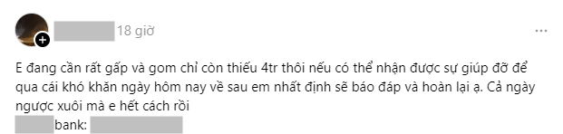 Quá trình này diễn ra rất đơn giản, không phải nhỏ bất cứ giọt mồ hôi nào hay làm việc gì tốn sức và tốn thời gian. Chỉ cần đăng một bài viết lên Threads về tình hình cấp bách của mình, đính kèm thông tin tài khoản ngân hàng gồm tên, số tài khoản hoặc mã QR rồi kêu gọi mọi người giúp đỡ. Thậm chí có người còn không thèm kể lể tình hình khốn khó hay đường cùng gì, chỉ xin là xin với nội dung huỵch toẹt: "Ai cho tui xin 2k đi ạ. Cảm ơn nhiều".