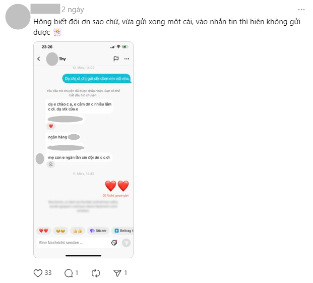 Một người dùng Threads tên N.Y kể lại: "Mình thấy bạn nữ kia đăng là 'Cầu mong mọi người chuyển giúp em 100k, em có việc rất cần tiền, em đội ơn mọi người'. Đọc xong mình cũng chuyển 100k luôn và nhắn tin hỏi thăm. Mấy ngày sau bạn đó vẫn im re, không nói năng gì luôn, vào xem thì thấy đã bị chặn mới biết mình dại".