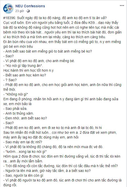 "Cực quá luôn. Em với người yêu bằng tuổi, 2 đứa đều K59…dạo này thấy bài độ ta không độ nàng cũng hot hot nên em có nghe liên tục mà mắc cái bệnh nói theo lời bài hát…người yêu em thì lại không thích bài hát đó, đơn giản vì không thích thôi ạ mà tính em lại nhây, càng không thích em càng trêu.