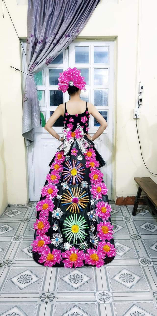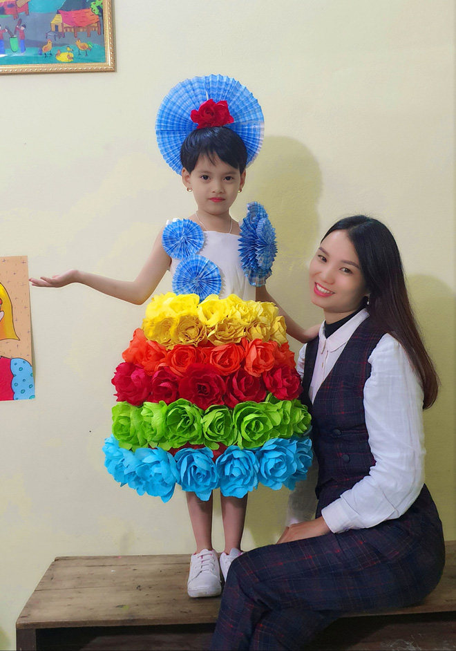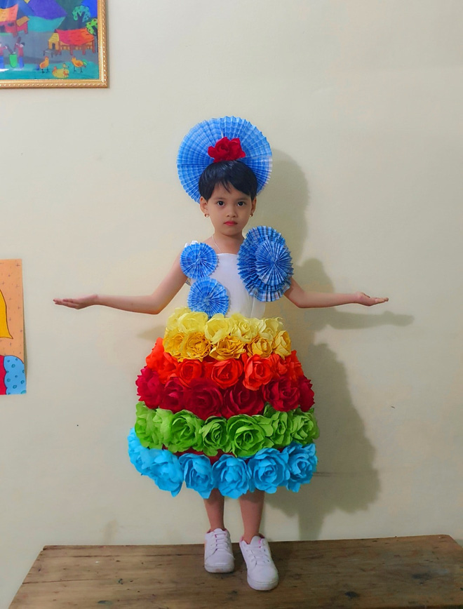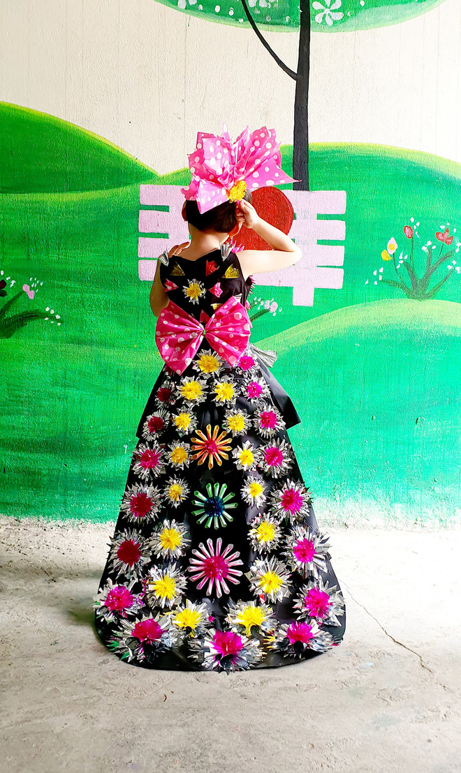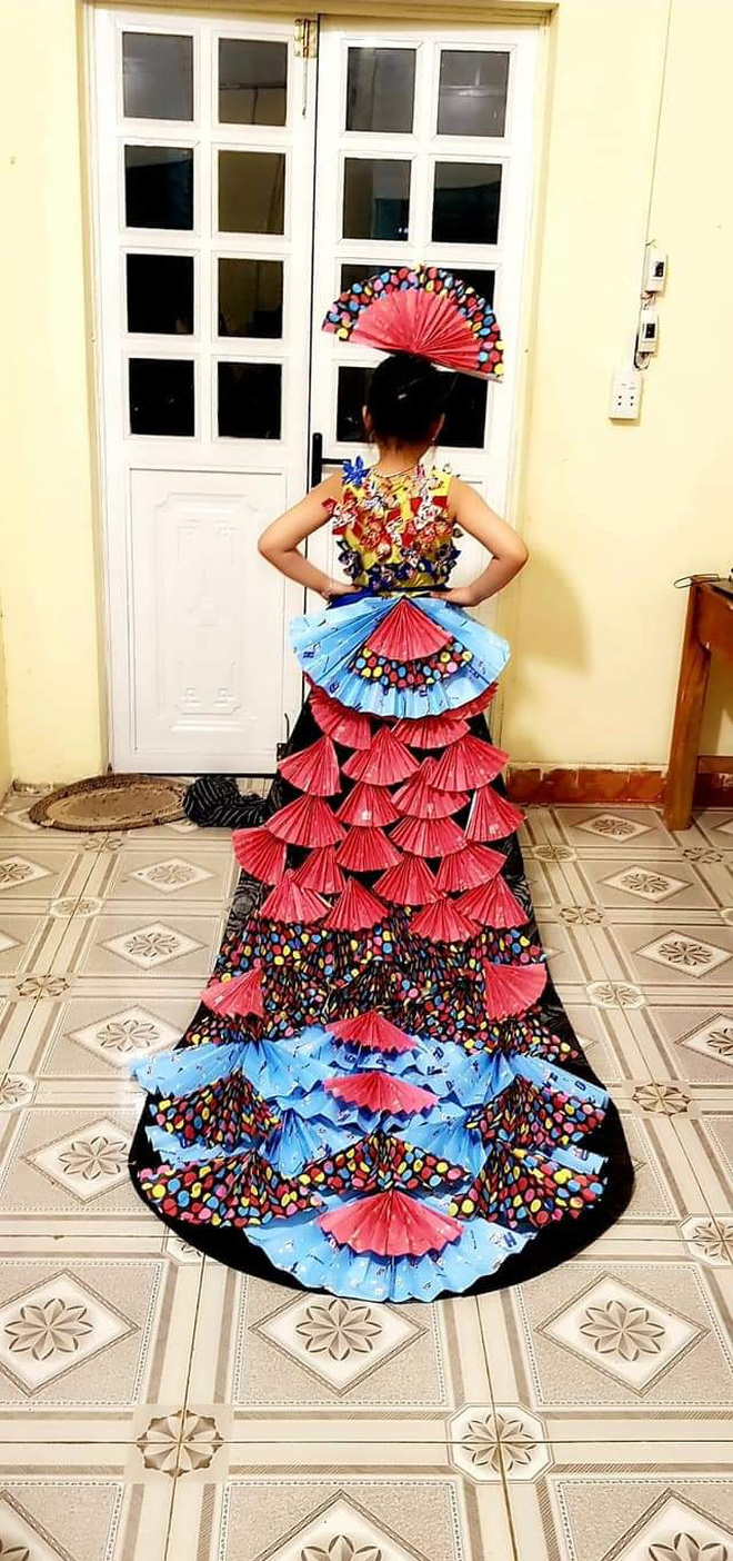 Bộ váy được dành riêng cho học sinh lớp cô chủ nhiệm. Điểm đặc biệt là dù chỉ dùng chất liệu giấy bỏ, băng dính, vải thừa... nhưng vẫn khiến nhiều người trầm trồ vì quá đẹp với những nét riêng không lẫn đi đâu được.