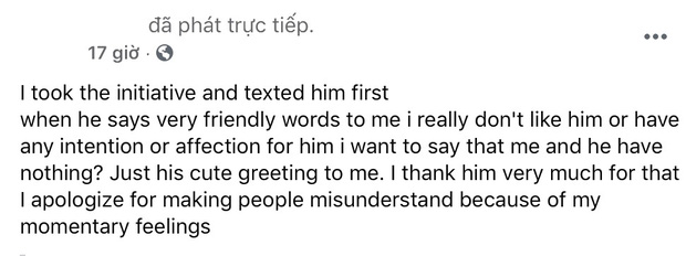 J.Y chia sẻ: "Tôi đã nhắn tin cho anh ấy trước. Khi anh ấy nói những lời rất thân thiện với tôi, tôi thực sự không thích anh ấy hoặc có ý định hay tình cảm gì với anh ấy. Tôi muốn nói rằng tôi và anh ấy không có gì cả. Chỉ là lời chào dễ thương của anh ấy dành cho tôi. Tôi cảm ơn anh ấy rất nhiều vì điều đó. Tôi xin lỗi khi đã khiến mọi người hiểu lầm vì cảm xúc trong thời gian của tôi." (Tạm dịch)