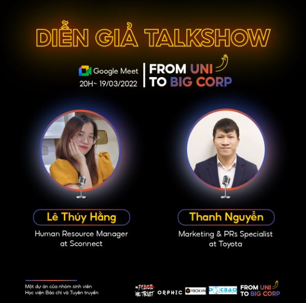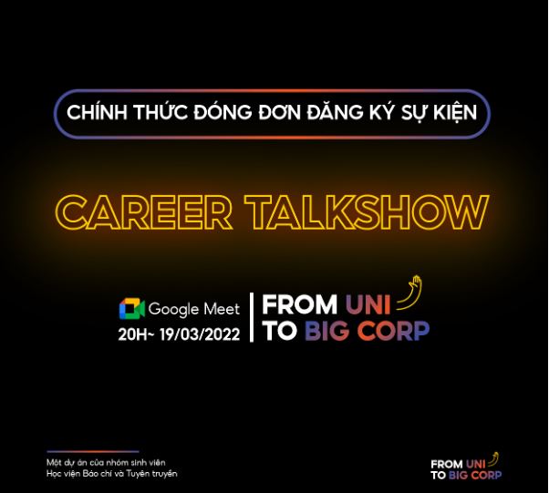 Talkshow From Uni To Big Corp – Fly Dream High lần đầu tiên được tổ chức bởi nhóm sinh viên khoa Quan hệ công chúng - Quảng cáo dưới sự hỗ trợ của Liên đoàn khoa và Ban giám đốc Học viện.