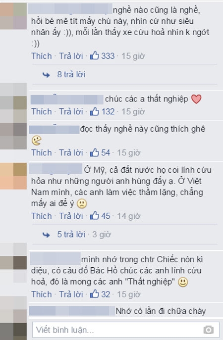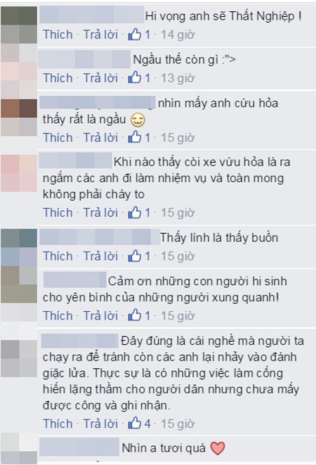 Dưới bức ảnh là khá nhiều những lời bình luận đáng yêu không kém dành cho anh chàng này như "chúc anh thất nghiệp", "hi vọng anh sẽ thất nghiệp" hay "anh đúng là anh hùng"... Comment "nghề nào cũng là nghề, hồi bé mê tít mấy chú này, nhìn cứ như siêu nhân ấy, mỗi lần nhìn thấy xe cứu hỏa là nhìn không ngớt" của một facebooker có tên L.T.T.Đ đã nhận được 333 lượt like của những người theo dõi.