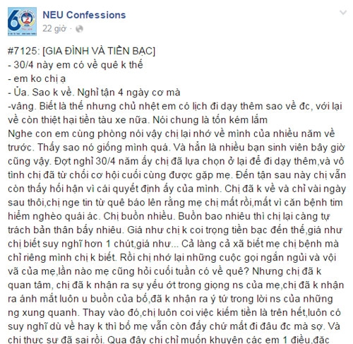Đợt nghỉ 30/4 năm ấy chị đã lựa chọn ở lại để đi dạy thêm và vô tình, chị đã từ chối cơ hội cuối cùng được gặp mẹ. Đến tận sau này, chị vẫn còn thấy hối hận vì cái quyết định ấy của mình.