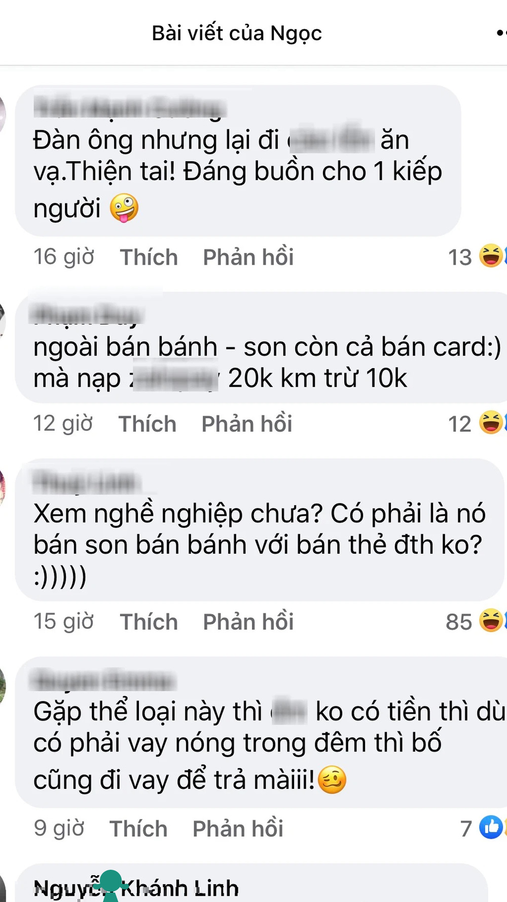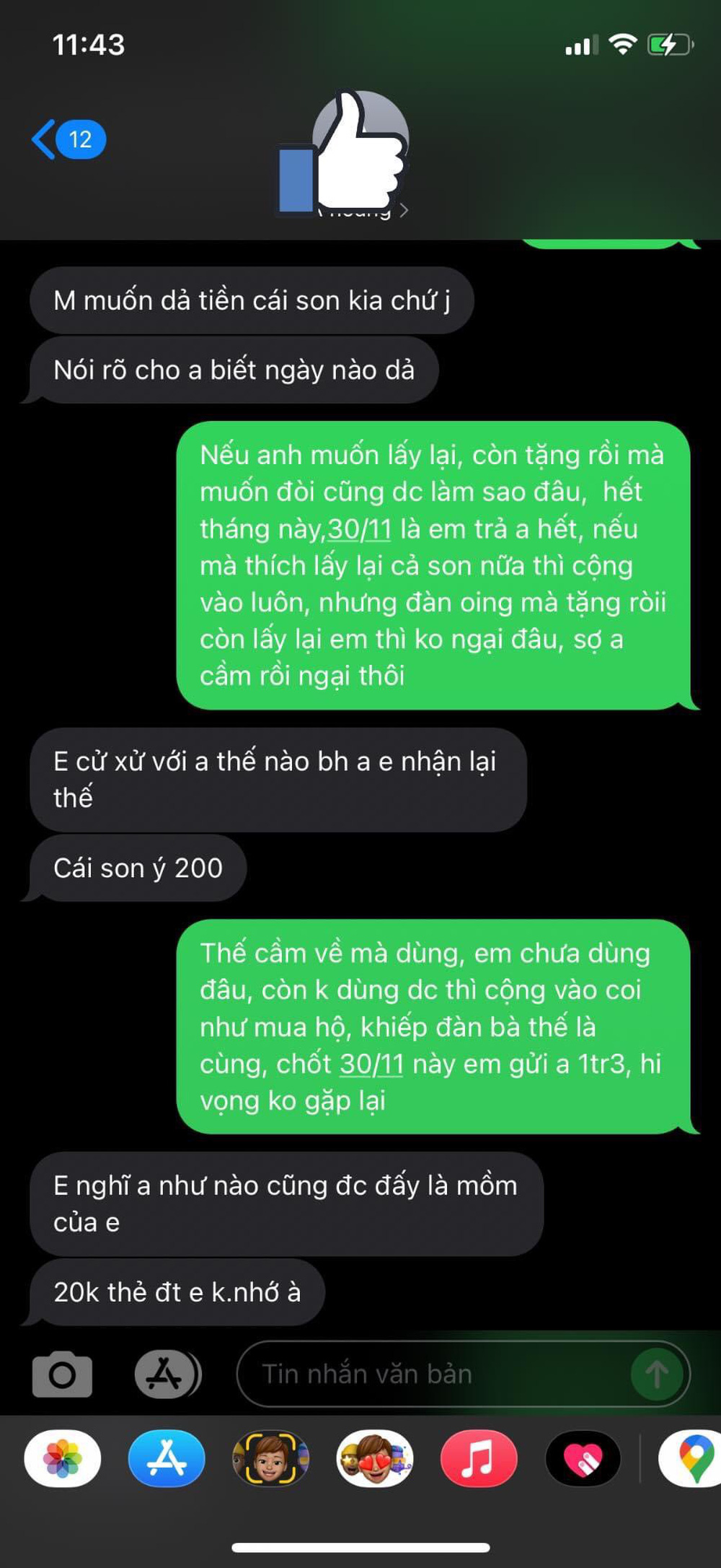 Đáng gờm nhất là cãi nhau xong, anh ta quay sang quy mấy món quà từng tặng mình ra tiền, đòi lại 1 triệu 100 nghìn tiền bánh và quà, 200 nghìn tiền son, còn đòi 20 nghìn tiền nạp card điện thoại."