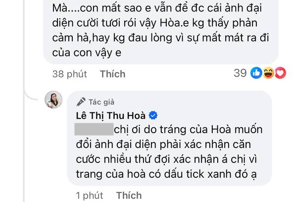 Trên trang cá nhân, tài khoản có tick xanh mang tên mẹ Bắp vẫn trả lời cư dân mạng về chuyện cô không đổi ảnh đại diện. Theo đó khi có người thắc mắc chuyện cô vẫn để ảnh đại diện cười tươi rói, tài khoản mang tên Thu Hoà trả lời: “Chị ơi do trang của Hoà muốn đổi ảnh đại diện phải xác nhận căn cước nhiều thứ đợi xác nhận á chị. Vì trang của Hoà có dấu tick xanh đó ạ”.