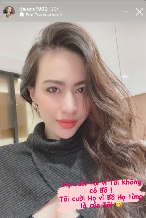 "Họ cười tôi vì tôi không có bồ! Tôi cười họ vì bồ họ từng là của tôi", Thảo Mi viết.
