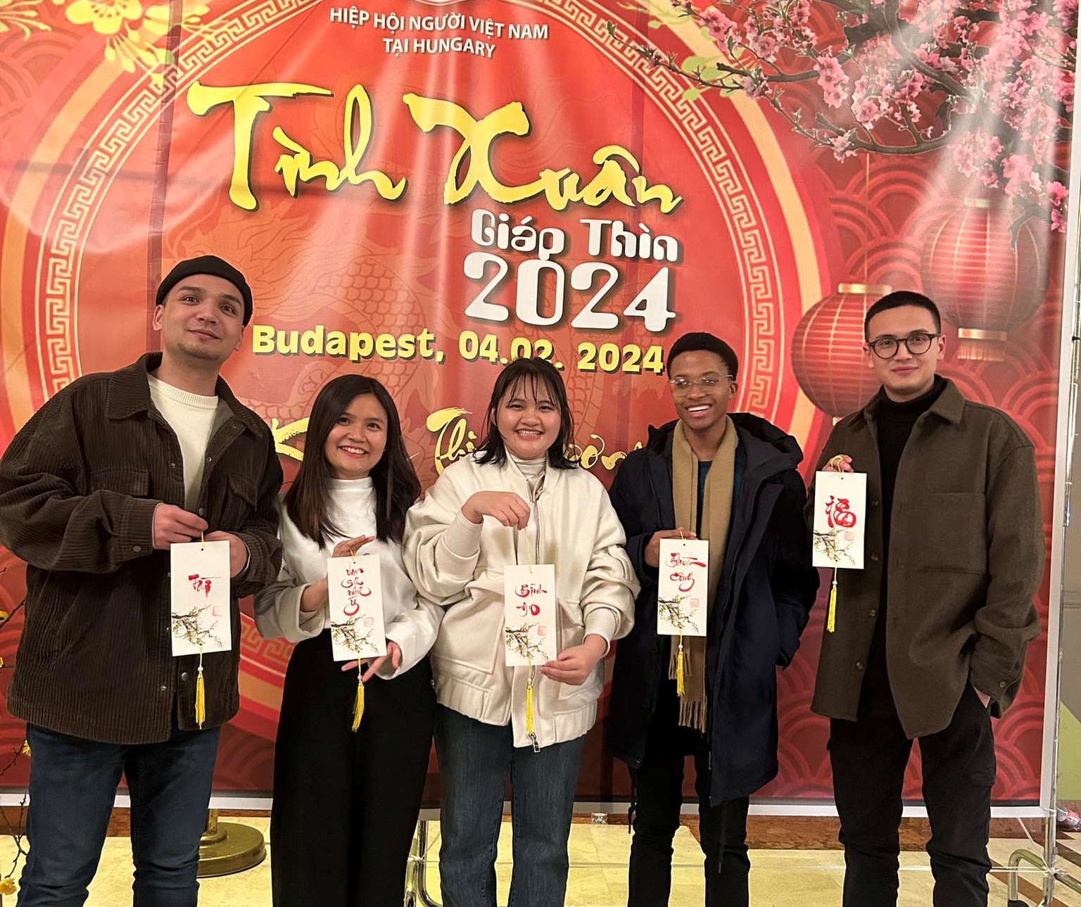 Năm nay, Cộng đồng người Việt và Hội sinh Việt Nam ở Hungary cũng tổ chức Tết Giáp Thìn chào Xuân năm mới cho những người con xa quê. Vì thế, dù không ở gần gia đình, Vân Anh vẫn được thưởng thức những món ăn truyền thống, tham gia các hoạt động quen thuộc đầu năm. Nữ sinh cũng mời những bạn cùng lớp của mình là người nước ngoài đến tham dự và xin chữ lộc đầu năm.