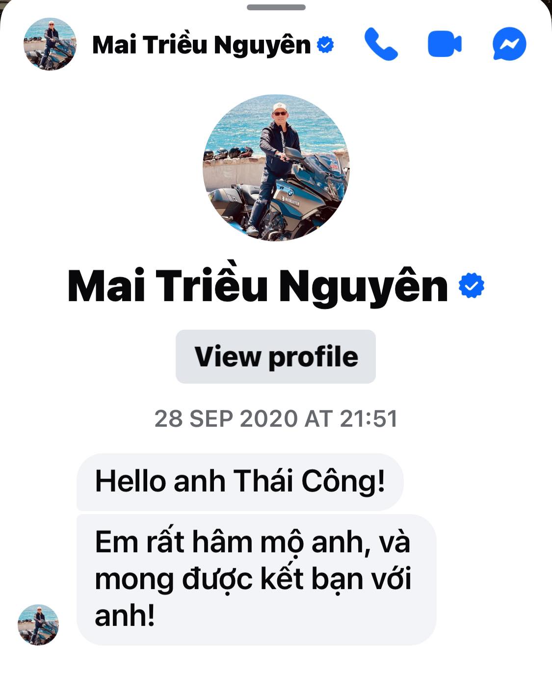 Đó là ảnh chụp màn hình Messenger, trong lần đầu 2 người kết nối, CEO Mai Nguyên chủ động kết bạn, thể hiện sự tôn trọng với Thái Công bằng từ "hâm mộ". Cũng vì lý do này, dân mạng cho rằng Thái Công lựa chọn hình ảnh không phù hợp, thiếu tinh tế, thậm chí nói NTK này "câu like", tranh thủ "PR bản thân"...