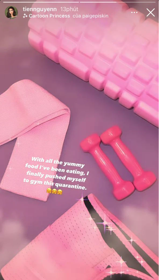 Tìm hiểu ra mới thấy, cách đây không lâu, Tiên Nguyễn cũng đăng tải story khoe bản thân "sắm sanh" một đống đồ tập từ tạ tay đến dây kháng lực... và tập tành chăm chỉ vô cùng trong suốt mùa dịch. Thế nhưng, lý do của cô nàng vừa đáng yêu, vừa buồn cười quá thể: Giảm cân để được ăn thêm nhiều món ngon. Chắc hẳn, nhờ có mục tiêu rõ ràng, quá trình nỗ lực của cô nàng đã có kết quả rồi đây.
