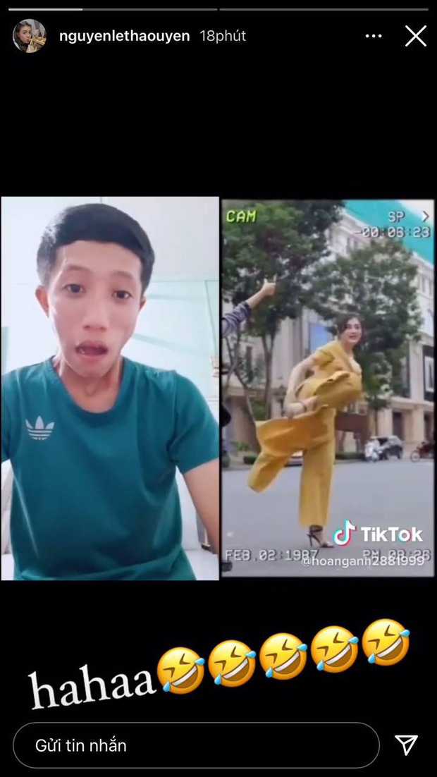 Mới đây, Thảo Uyên đăng story video phản ứng của một anh chàng khi xem mình "đi đường quyền", giơ chân đá đồ vật ở trên cao. Kèm theo đó là icon "dở khóc dở cười" khi chứng kiến đoạn clip này của cô nàng.