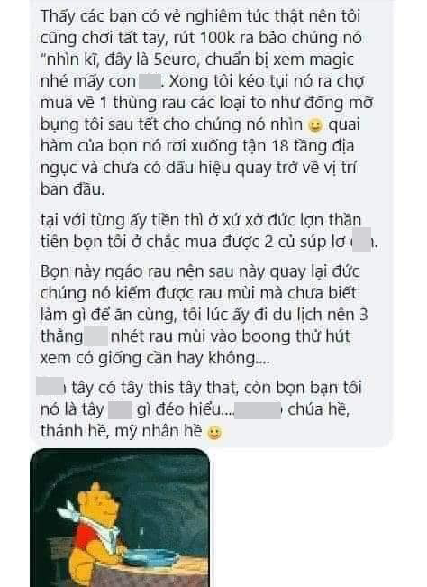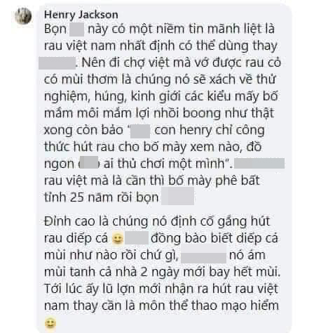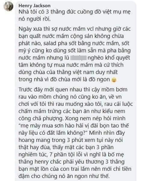 "Trước mới quen biết nhau thì cạy mồm bơm rau vào chúng nó không ăn. Về Việt Nam chơi với tôi thì rau muống xào tỏi, rau cải luộc chấm mắm trứng các bạn ăn như kiểu nem công chả phượng. Xong nem nép vào hỏi mình: “Mẹ mày mua sơn hảo hải vị đãi bọn tao thế này liệu có đắt lắm không?”. Mình nhìn đầy hoang mang trong 3 phút xem tụi này nói thật hay đùa. Thấy mặt các bạn 3 phần nghiêm túc, 7 phần tội lỗi vì nghĩ là bố mẹ thằng Henry (tên tôi) chắc phải yêu thương 3 thằng bạn của con trai lắm nên mới chi tiền đậm cho chúng nó ăn ngon như thế.".