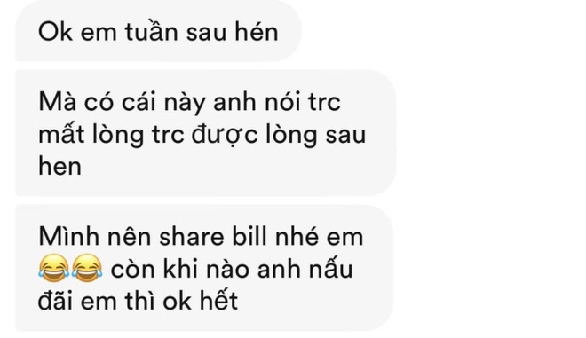 Tuy nhiên trước khi buổi hẹn diễn ra chàng trai đã nhắn tin đề nghị share bill. “Có cái này anh nói trước vì mất lòng trước được lòng sau. Mình nên share bill nhé em. Còn khi nào anh nấu đãi em thì oke hết” - anh nói với cô gái.