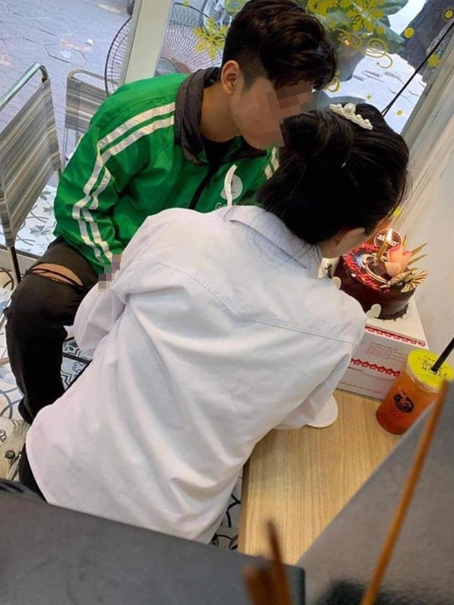 Kèm theo câu chuyện là hình ảnh của cặp đôi chàng làm Grab, nàng là học sinh. Một bữa tiệc sinh nhật giản dị với chiếc bánh gato nhỏ xíu, 1 ngọn nến và 2 cốc đồ uống. Dù không có pháo, đèn long lanh, không có bong bóng, hoa hồng nhưng hoàn cảnh đơn sơ như vậy đã là quá đủ để họ thêm thương mến nhau.